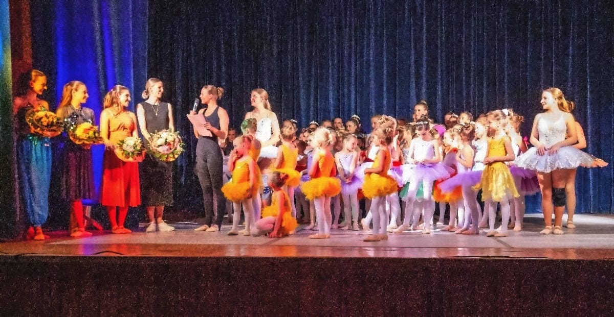 Nach dem Finale bedankte sich Maren Mauch im Namen der ganzen Ballett- und Tanzklassen der Musikschule Dunningen bei Lydia Melvin für ihr großes persönliches Engagement. Von links nach rechts mit Blumenstrauß: Die Schülermentorinnen Leni Günthner, Lena Weigold und Samira Braun, die Leitung der Ballett- und Tanzklassen Lydia Melvin und Schülermentorin Maren Mauch.