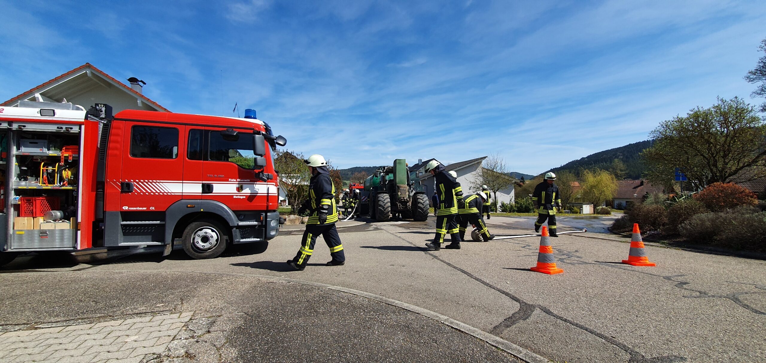 Mit insgesamt 40 Kräften aus vier Dietinger Teilorten und zudem zur Unterstützung mit einem Löschfahrzeug aus Rottweil rückte die Feuerwehr unter dem Kommando von Dominik Weißer an. Außerdem vor Ort: Kreisbrandmeister Nicos Laetsch und sein Stellvertreter, Frank Müller.