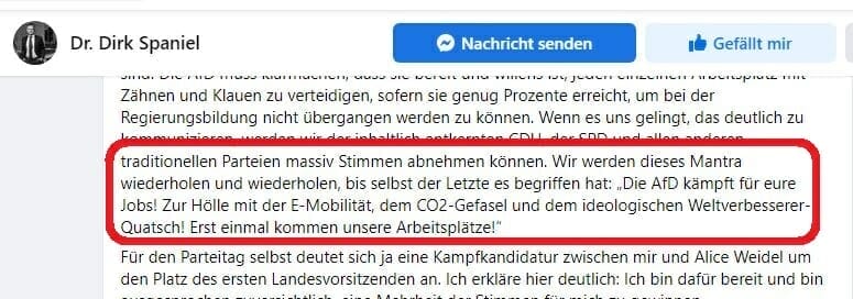 Er schrieb weiter: „Wir werden dieses Mantra wiederholen und wiederholen, bis selbst der Letzte es begriffen hat: ‚Die AfD kämpft für eure Jobs! Zur Hölle mit der E-Mobilität, dem CO2-Gefasel und dem ideologischen Weltverbesserer-Quatsch! Erst einmal kommen unsere Arbeitsplätze!‘“