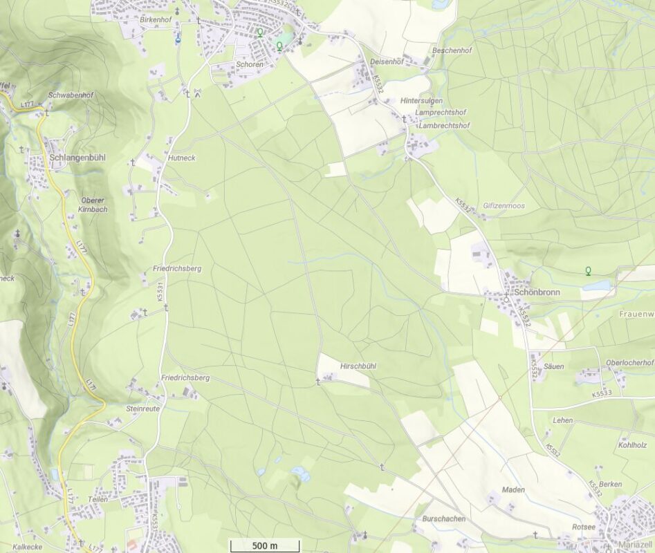 Alle Anlagen befinden sich außerhalb des gesetzlich vorgeschriebenen Mindestabstands, teilweise allerdings sehr nah dran. Gut zu erkennen ist, dass es im Wirtschaftswald Feurenmoos bereits zahlreiche Holzabfuhrwege gibt. Diese wollen die Anlagenbauer nutzen, um möglichst wenig zusätzliche Flächen zu beanspruchen.