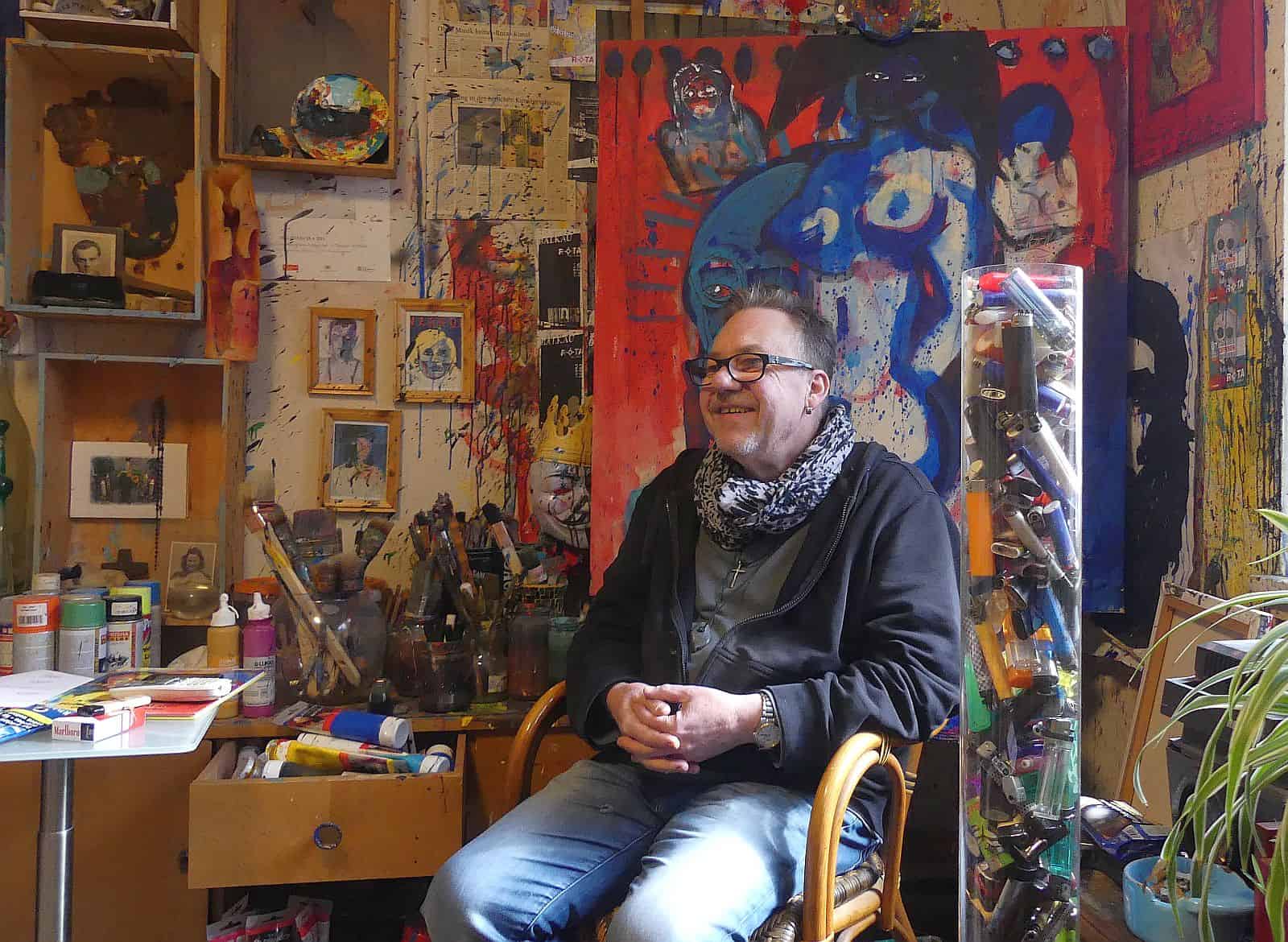 Immer wieder tauchen auch Totenschädel auf seinen Bildern auf. Aber auch Kronen. Nein, mit Königen hat er nichts am Hut. „Die Kronen, da kann man von oben rein fassen in den Kopf. Das ist ein dummer König, der hat nichts im Kopf“, sagt er mit Blick auf eines seiner großformatigen Bilder im Atelier. Seine Malerei sei subversiv, er kritisiere die Obrigkeit ganz allgemein.