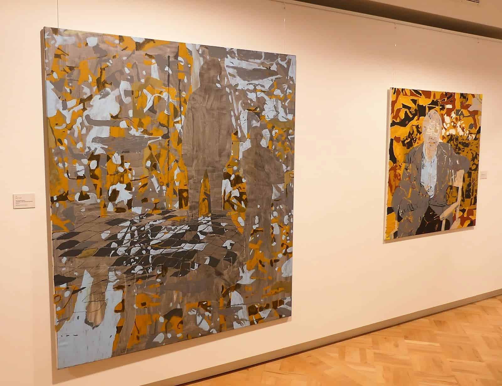 Die Porträtarbeiten seien während der Coronapandemie entstanden. Trevisan erfasse bekannte und von ihm verehrte Künstlerkollegen intuitiv. Dafür verwende er Fotos und setze das Ganze in einer eigene Bildsprache um. Ramm-Weber beschrieb die Entstehung der Bilder, die Trevisan auf einem grauen Untergrund gestalte. „Darüber sind farbige, bewusst unordentlich gestaltete Bildteilchen gelegt. Auf den ersten Blick scheinbar ungeordnet.“ Auf dieser Struktur entstünden dann die Porträts als Übermalungen, Schattenrisse.