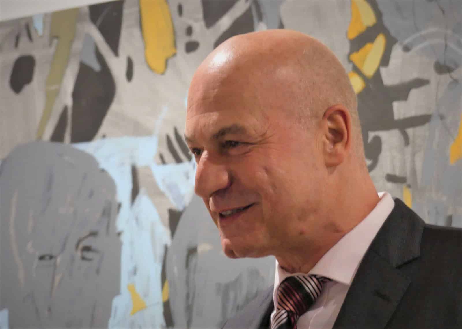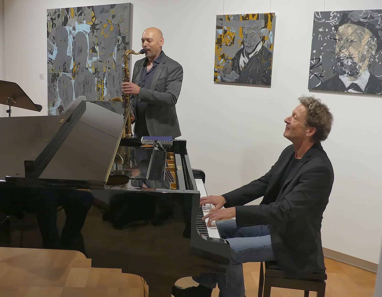 Schwungvoll begrüßten Arno Haas (Saxophon) und Ull Möck (Klavier) das Publikum mit einem Jazzstandard. Norbert Swoboda in seiner Doppelrolle als Lauterbacher (Noch-) Bürgermeister und Vorsitzender des Kunstvereins Wilhelm Kimmich hieß die Gäste willkommen. Unter ihnen seinen Nachfolger (und ab 5. Dezember Hausherr in der Galerie) Jürgen Leichtle.
