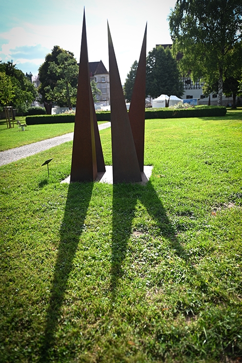 Der Aufruhr von 1524/25 wird im Glatter Wasserschloss beleuchtet, das umgebende Areal beleben Skulpturen Jürgen Knubbens. Das bildet einerseits einen starken Kontrast: Auf einer einen Seite der aufs Zarte zielende Renaissance-Stil, auf der anderen die Kantigkeit einer geometrischen Moderne.