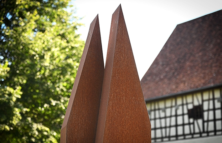 Darin, dass sich Knubbens stählerne Körper biegen und winden kann man aber auch etwas Verbindendes sehen: Drinnen wie draußen geht es um Kräfte, die wirken, gewissermaßen um das Standhalten und Nachgeben. Und während drinnen ein halbes Jahrtausend zurückgeschaut wird, zeugt die Patina auf den zeitgenössischen Kunstwerken überdeutlich von vergehender Zeit.