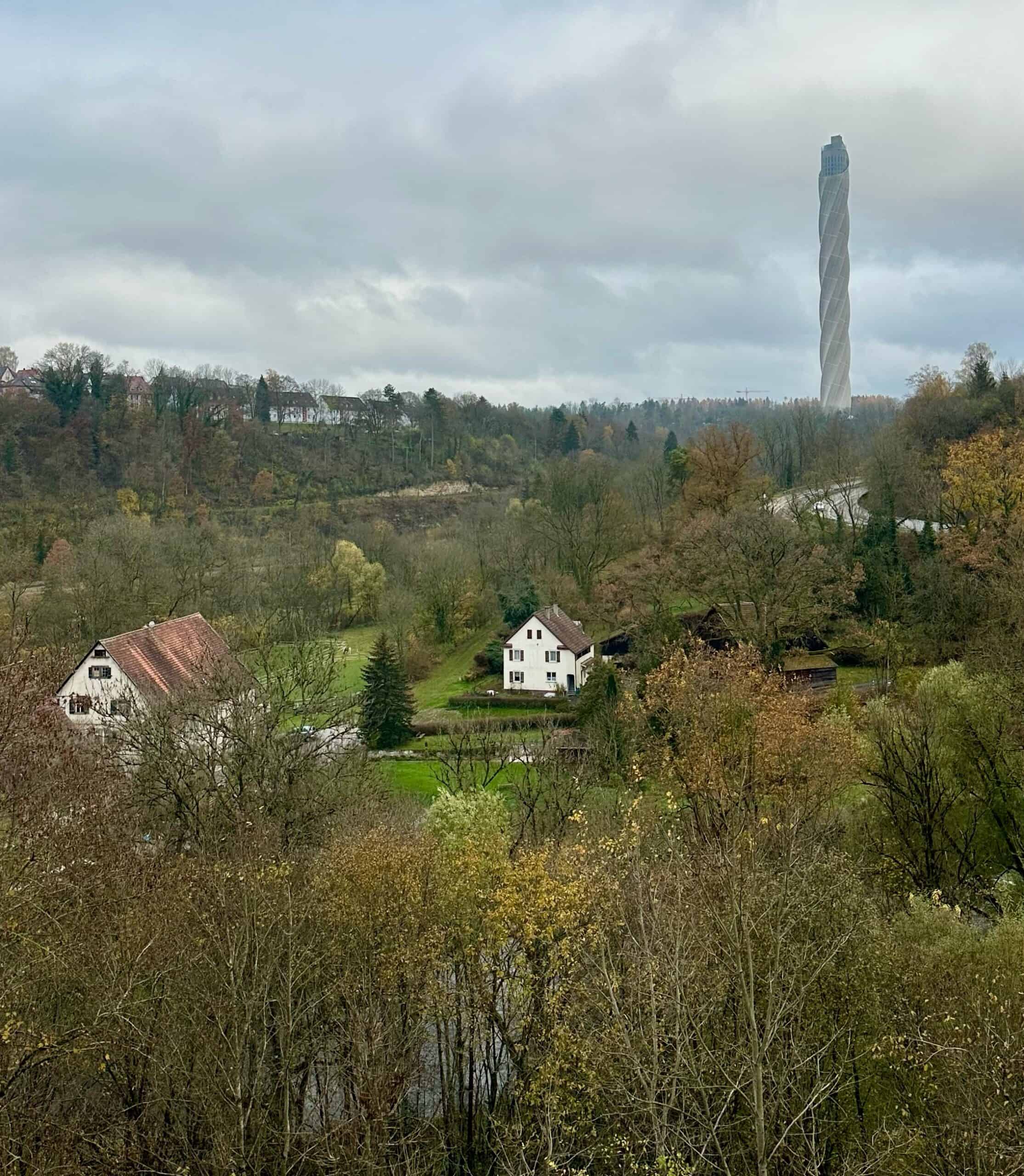 Dass die Briten wohl aus Gründen der Zuspitzung behaupten, der Turm sei eingebettet in einen Wald, er erhebe sich „dramatisch über die Bäume“ – sei’s drum. Auf einer Fotoplattform haben sie ein Bild gefunden, das im Vordergrund des Turms das Neckartal nahe der Dreher’schen Mühle zeigt. Und glauben deshalb: „Der Aufzugstestturm befindet sich in der Nähe einer ruhigen Waldstadt.“ Der Fotograf des Bildes hätte sich nur etwas weiter nach links wenden müssen, um das zu widerlegen. Egal. It doesn’t matter.
