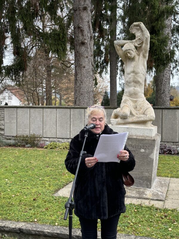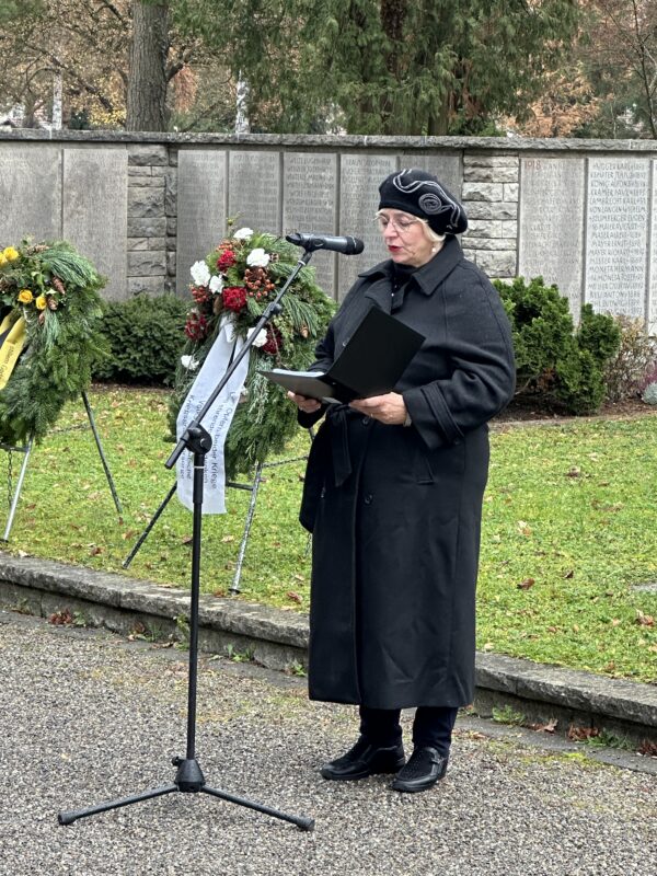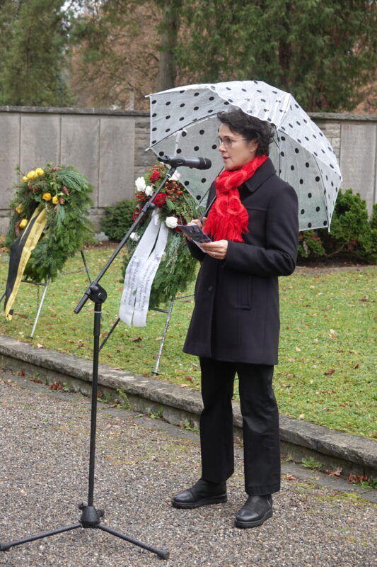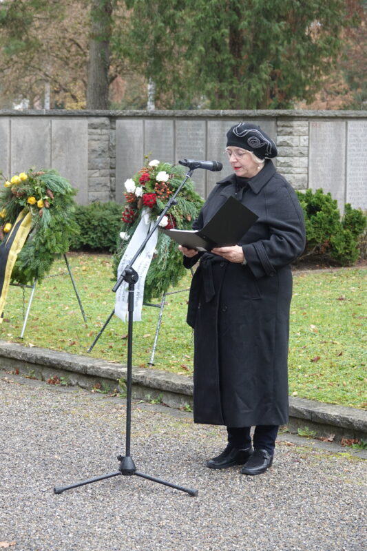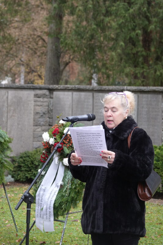 Susanne Birkenmaier vom Volksbund Deutsche Kriegsgräberfürsorge bedankte sich bei allen Teilnehmerinnen und Teilnehmern und all jenen, die zum Gelingen der Gedenkfeier beigetragen hatten. Im Anschluss lud der Volksbund die Teilnehmerinnen und Teilnehmer der Gedenkfeier noch dazu ein, neben dem Ehrenmal für die Gefallenen der beiden Weltkriege auch die Gedenkstätte für Zwangsarbeiter aus der ehemaligen Sowjetunion zu besuchen, die auf dem Ruhe-Christi-Friedhof bestattet wurden.