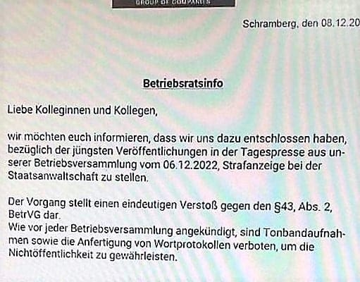Update 13. Dezember: Nach Informationen des „Schwarzwälder Boten“ hat der betriebsrat inzwischen Strafanzeige bei der Statsanwaltschaft gestellt. Dies habe der Betriebsrat in einem Betriebsratsinfo bekannt gemacht. Welche Informationen in unserem Bericht von der Betriebsversammlung das Unternehmen „nachhaltig schädigen“, bleibt weiterhin unklar.