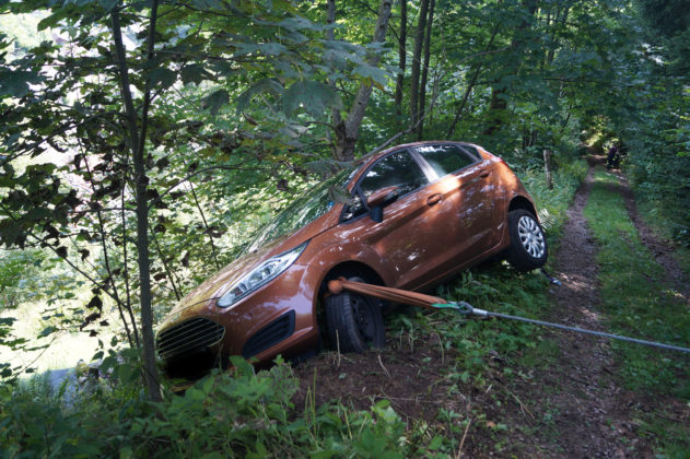 Rund 200 Meter Weg unterhalb des Hauses Berlin war Endstation. In einer engen und steilen Linkskurve rutschte das Fahrzeug zurück und blieb unmittelbar neben dem Weg am Berg hängen. Wäre das Fahrzeug dort nicht hängen geblieben, hätte die Gefahr bestanden, dass es den Berg bis zur Firma King hinab rutscht.