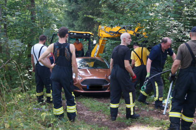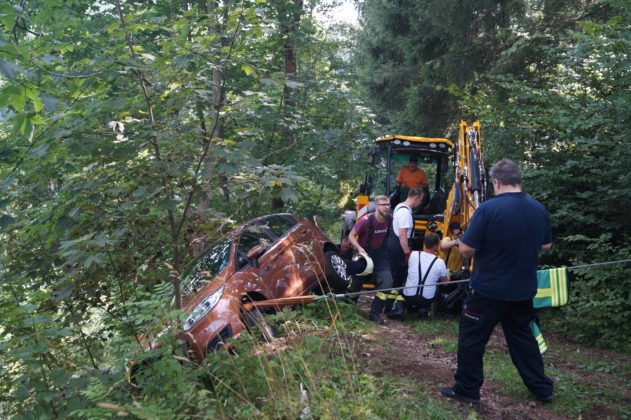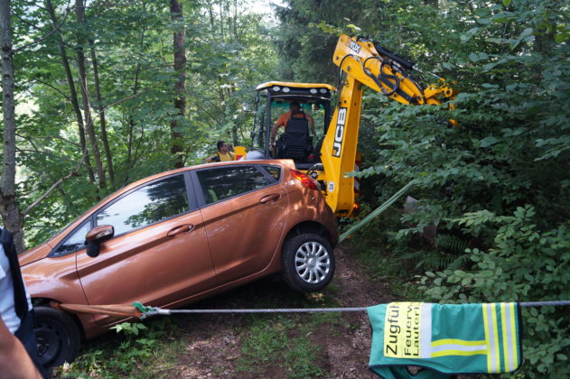 Wie steil der unbefestigte Weg ist, zeigte sich daran, dass die Rettungskräfte den letzten und besonders steilen Teil des Wegs samt Material zu Fuß zurücklegten. Damit das Fahrzeug nicht abrutscht, wurde es von der Feuerwehr mit einem Stahlseil gesichert. Geborgen wurde es schließlich mit Hilfe des Radladers aus dem Lauterbacher Bauhof. Feuerwehrkommandant Markus Pfundstein steuerte das Fahrzeug dann im Schritttempo bis zu einem Parkplatz, wo es vom Abschleppdienst übernommen wurde.