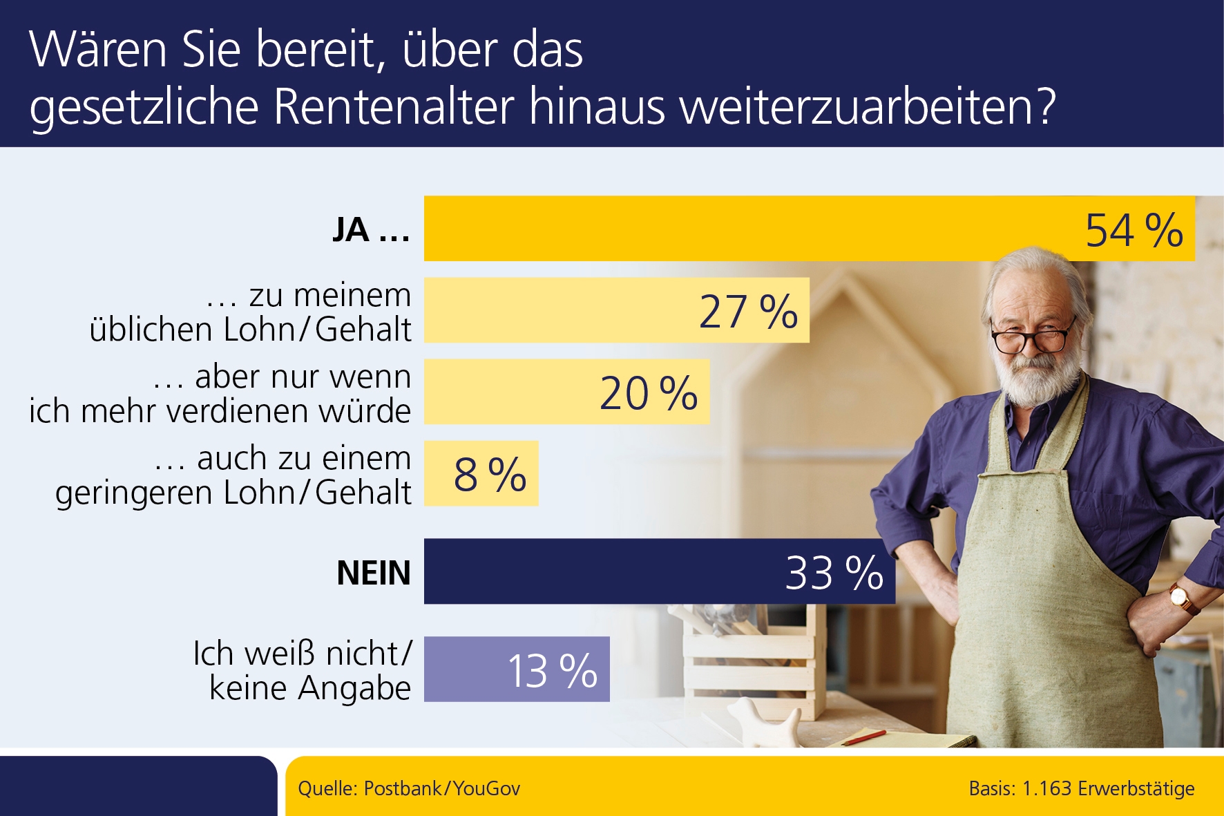 Die Be­reit­schaft, über das ge­setz­li­che Ren­ten­al­ter hi­­n­aus wei­ter­zu­ar­bei­ten, ist hoch: Laut ei­ner ak­tu­el­len You­Gov-Um­fra­ge im Auf­trag der Postbank ist mehr als je­der zwei­te Er­werbs­tä­ti­ge (54 ­Pro­zent) grund­sätz­lich be­reit, im Ren­ten­al­ter be­ruf­lich ak­tiv zu blei­ben.