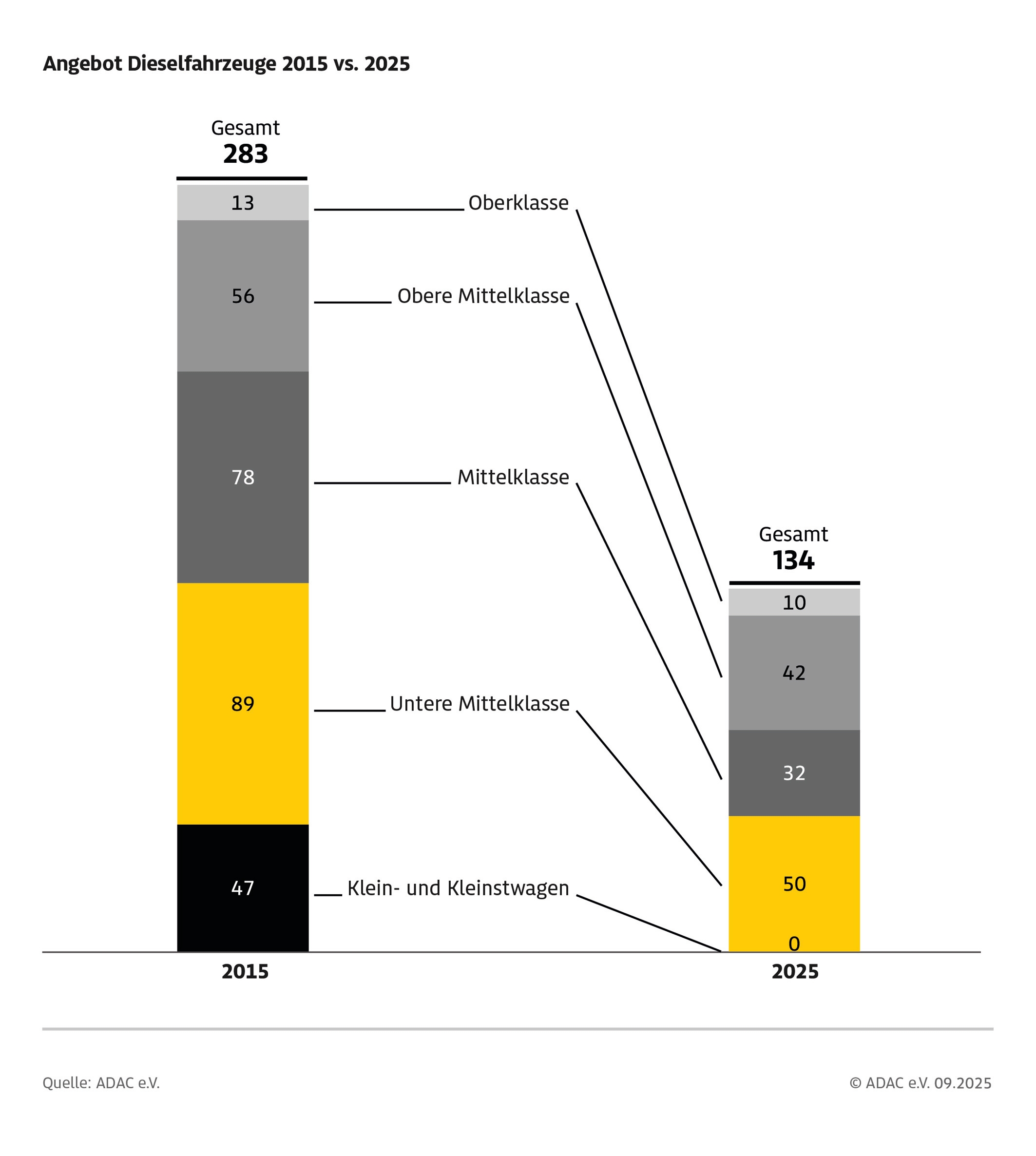 Betrachtet wurde der Zeitraum zwischen 2015 und 2025 anhand von Daten aus der ADAC Autodatenbank. In dieser Zeit nahm das Angebot an Dieselfahrzeugen in Deutschland um mehr als 50 Prozent ab. Besonders prekär ist die Entwicklung bei den Kleinst- und Kleinwagen: Gab es vor zehn Jahren noch 47 Fahrzeugmodelle mit Dieselmotor, so ist dieses Segment heute ausgestorben – kein einziges Auto wird mehr angeboten. In der Mittelklasse, in der ein Selbstzünder früher quasi Standard war, hat sich das Portfolio mehr als halbiert. Besonders bei den Kombis ist das Angebot merklich geschrumpft – ganze fünf Modelle stehen heute noch zur Auswahl.