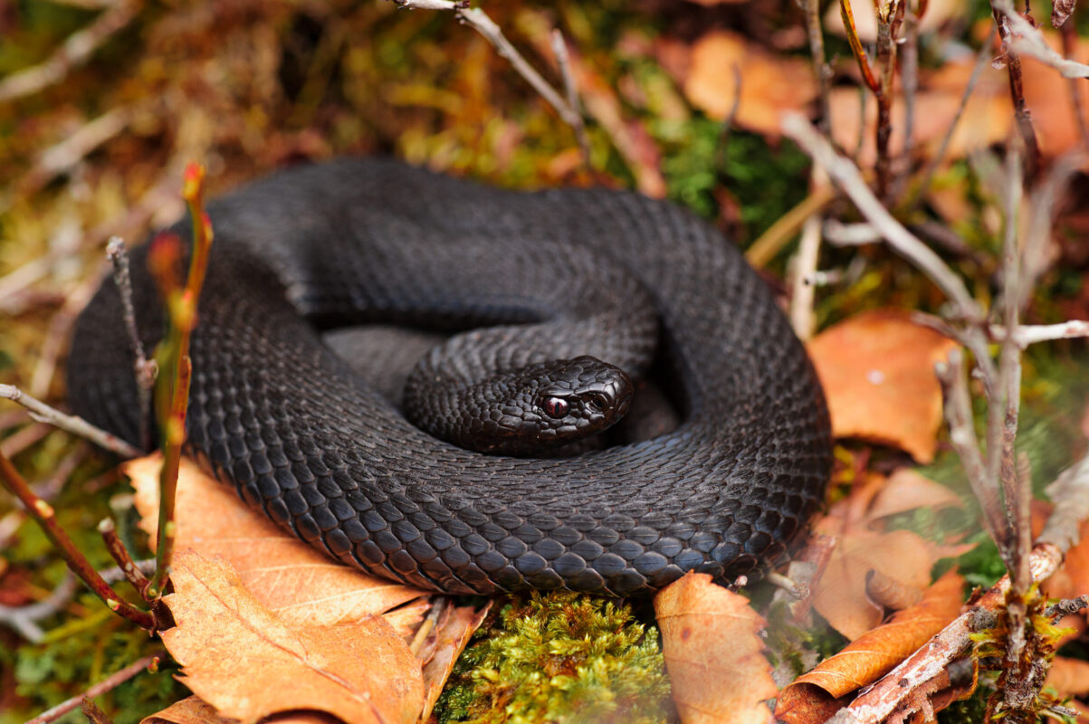 Sie ist so schwarz, als käme sie direkt aus der Hölle. Eine im Volksmund „Höllenotter“ genannte Schlange ist eine dunkel gefärbte Kreuzotter. In Baden-Württemberg trifft man mit viel Glück in den kühleren Höhen im Schwarzwald, auf der Schwäbischen Alb und in Oberschwaben auf die scheue Giftschlange. Zu ihrem Schutz braucht sie ungestörte Orte mit sonnigen Steinhaufen, Böschungen und Totholz, gerne in der Nähe von Zwergsträuchern wie Heidelbeere oder Erika, auf denen sie sich in der Sonne aufwärmen kann.