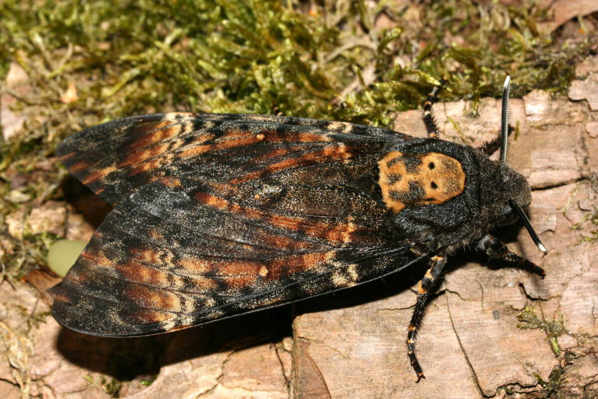 Dieser große Nachtfalter ist ein Hingucker: Der Wanderfalter hat einen dunkel marmorierten, pelzigen Körper und eine Totenkopf-ähnliche Zeichnung auf der Rückseite. Seine großen Raupen gibt es gleich in drei Farben: gelb, grün und braun. Bei der Nahrung sind Totenkopfschwärmer Schleckermäuler und saugen Honig aus Waben. Damit sie nicht gestochen werden, tarnen sie sich mit einer Art Bienenparfum.