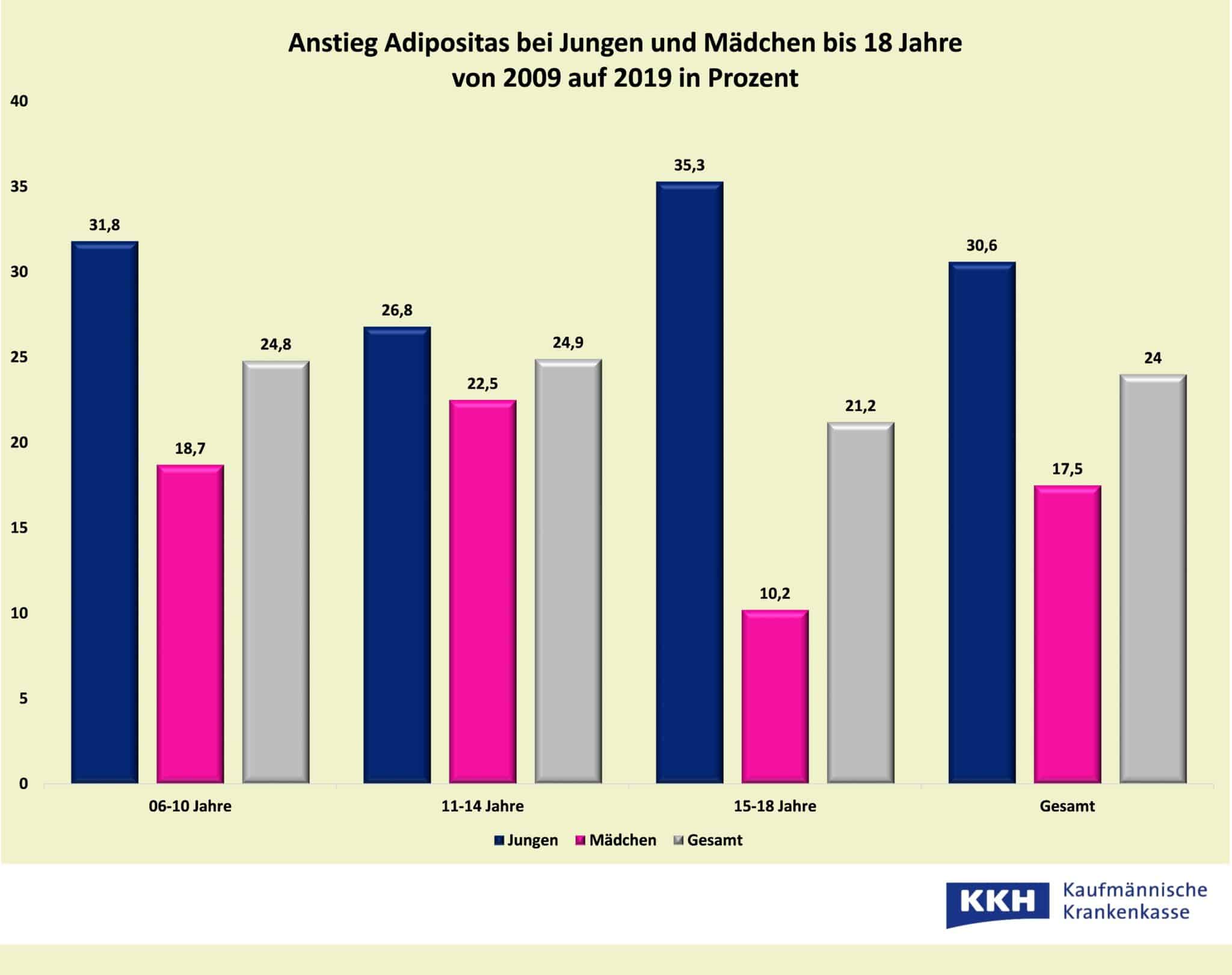 Die Krankenkasse KKH bestätigt das. Die Zahl der Kinder und Jugendlichen bis 18 Jahre, die unter extremem Übergewicht leiden, hat laut KKH-Bericht von 2009 auf 2019 bundesweit um rund ein Viertel zugenommen (24 Prozent). Damit erhielten mehr als 11.000 KKH-Versicherte bis 18 Jahre die Diagnose Adipositas, wie eine aktuelle Datenerhebung der Krankenkasse zeigt.