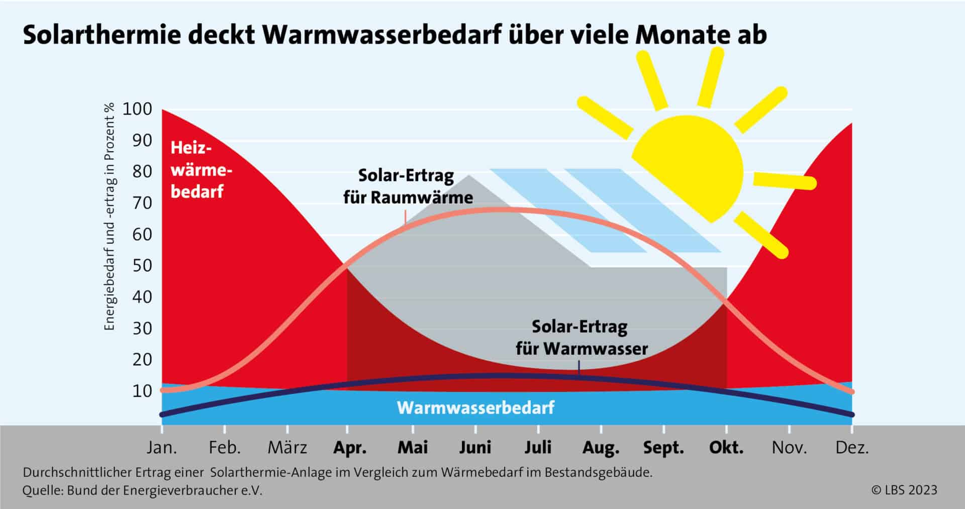 Hausbesitzerinnen und -besitzer können die Kraft der Sonne gleich doppelt anzapfen: zur Stromproduktion via Fotovoltaik und zur Warmwasserproduktion mithilfe einer thermischen Solaranlage. Diese liefert Wärme für das Brauchwasser und auf Wunsch sogar zur Unterstützung der Heizung. Mit Solarthermie können auch ältere Eigenheime unabhängiger von fossilen Brennstoffen werden. Eine Heizungsmodernisierung ist eine gute Gelegenheit, eine solche Solaranlage gleich einzubauen, empfiehlt die LBS.