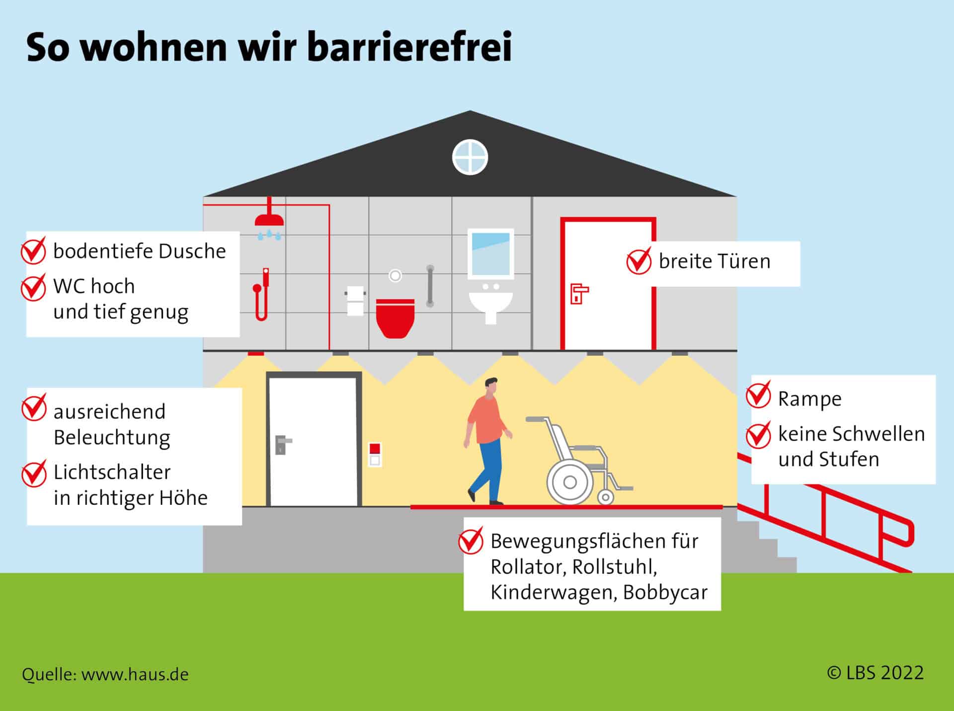 Der Bau oder Kauf von Wohneigentum ist für die meisten Menschen zweifellos die größte Investition im Leben. Allein deswegen sollte die Immobilie möglichst lange und uneingeschränkt nutzbar sein. Und gerade für ältere Menschen ist es wichtig, so lange wie möglich im vertrauten Umfeld leben zu können. „Vieles, was das Leben mit körperlichen Einschränkungen erleichtert, bedeutet aber zum Beispiel auch für Familien mit Kindern mehr Lebensqualität“, sagt Monika Grave von der LBS. „Geräumige Flurflächen etwa bieten einem Rollator genauso Platz wie einem Kinderwagen. Bei Umbau und Renovierung lohnt es deshalb, frühzeitig an barrierefreie Lösungen und Wohnkomfort für alle Generationen zu denken.“