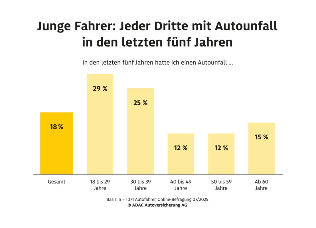 2024 wurden in Deutschland insgesamt rund 2,5 Millionen Verkehrsunfälle polizeilich erfasst. 18 Prozent aller Umfrageteilnehmer hatten nach eigenen Angaben in den letzten fünf Jahren einen Autounfall. Beim Blick aufs Alter zeigen sich allerdings deutliche Unterschiede: Während unter den jungen Fahrern zwischen 18 und 29 Jahren fast jeder Dritte (29 Prozent) in einen Unfall verwickelt war, waren es nur 12 Prozent der Fahrer zwischen 40 und 59 Jahren.