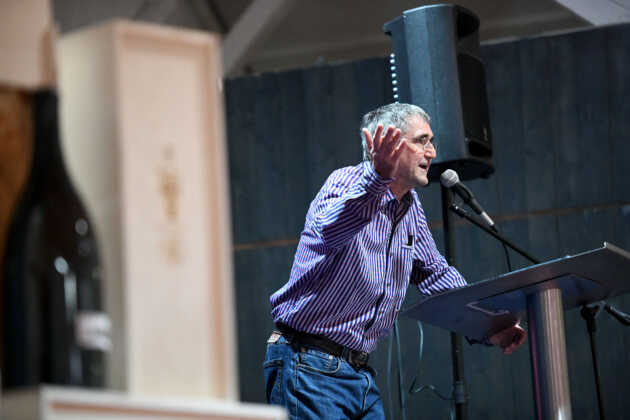 Coronabedingt wurde die Vernissage vom Bürgersaal entkoppelt. Zahlreiche, teils weit gereiste Gäste feierten mit gebührender Distanz in der Alten Stallhalle. Nach einer stilbewussten Stärkung mit Linsen und Spätzle entfachte Markus Schellhorn als launiger Auktionator Lust am Investieren. Denn zum Fünfzigsten des Forums Kunst lockten je fünf Flaschen eines jubiläumswürdigen Rot- und Weißweins. Mit ihm können dem die Erwerber den Kunstgenuss fortsetzen, ganz ohne Setzkasten-Begrenzung.