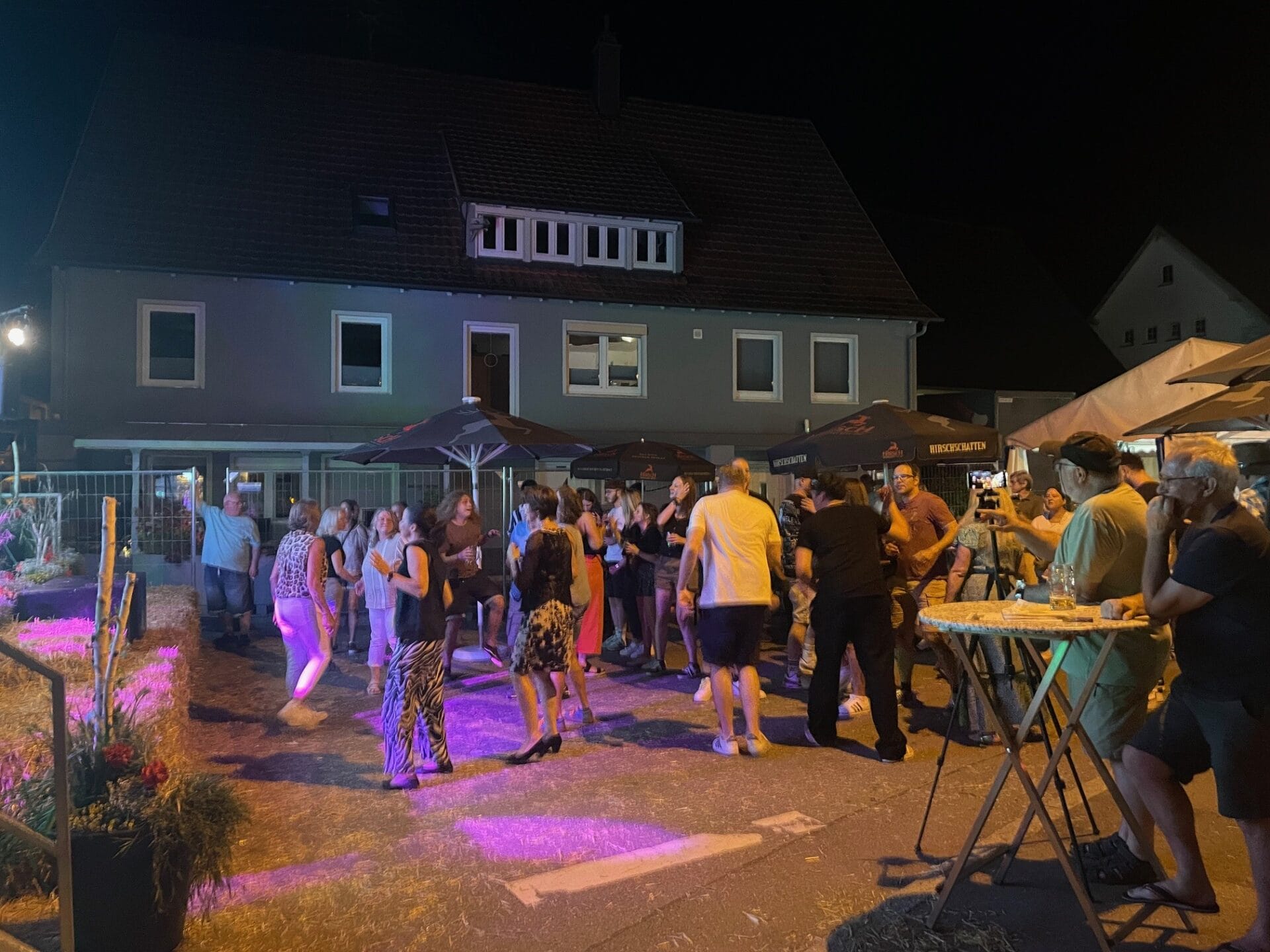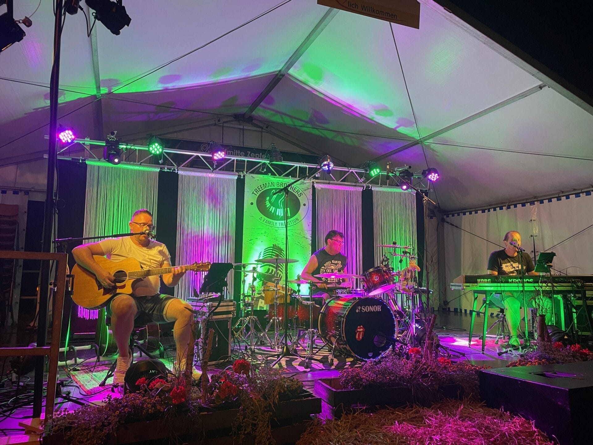 Danach gab es für die Party kein Halten mehr. Bei mehr als sommerlichen Temperaturen wurde gelacht, gegessen, getrunken und getanzt bis in die frühen Morgenstunden. Den passenden Sound hierzu lieferte die Band „Threeman Brothers“ mit unserem ortseigenen, talentierten Schlagzeuger Dominik Schmid.
