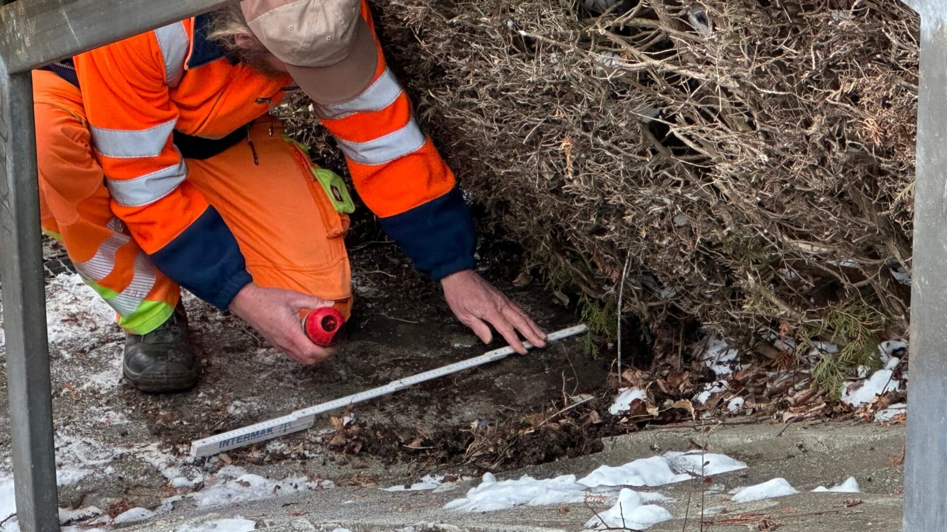 4,50 Meter Lichtraumprofil über dem Sträßchen, 2,5 Meter über der Treppe, alles auf die Breite des städtischen Wegs. Das ist das Ziel der Rückschnittsaktion, die am Montagmorgen um acht Uhr angelaufen ist. Ein privater Dienstleister ist mit einem Kleinbagger samt Großschere auch für störrige und dicke Äste angerückt und rasiert die Hecke ab. Ein Container steht bereit, in den Mitarbeiter des Betriebs das Grüngut befördern. Drei, vier dieser Container werden an diesem Tag gefüllt, so viel Hecke muss weg. Mitarbeiter eines ebenfalls privaten Vermessungsbüros unterstützen die Arbeiten, indem sie die Zielmarken setzen – leuchtend rote Striche aus einer Sprühdose markieren die Linie, bis zu der die Hecke zurückzuschneiden sei. Klar ist, dass nicht mehr viel von ihr übrig bleiben wird. Aber sie ragte einfach viel zu weit in einen Verbindungsweg zwischen Kampitsch- und Zollernstraße hinein, hatte auch schon eine Rampe für Fahrräder und Kinderwagen längst unbenutzbar gemacht. Übrigens: Diese Rampe samt der dazugehörigen Treppe soll sehr zeitnah gerichtet werden, wohl bereits im kommenden Frühjahr, vielleicht schon ab März, erfuhr die NRWZ. Die Stadt ist ohnehin derzeit dabei, einige Treppen um die Grundstraße herum zu sanieren.