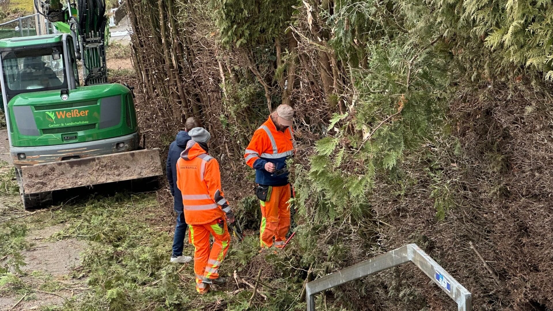 Der vonseiten der Stadtverwaltung erwartete Widerstand gegen die Aktion blieb am Vormittag aus. Mit dem Besitzer der Hecke liegt die Stadtverwaltung eigentlich seit Jahren im Clinch, zuletzt hatte der Anwohner einen Rechtsanwalt beauftragt. Doch die Arbeiten verlaufen jedenfalls in den ersten Stunden vollkommen unbehelligt ab.