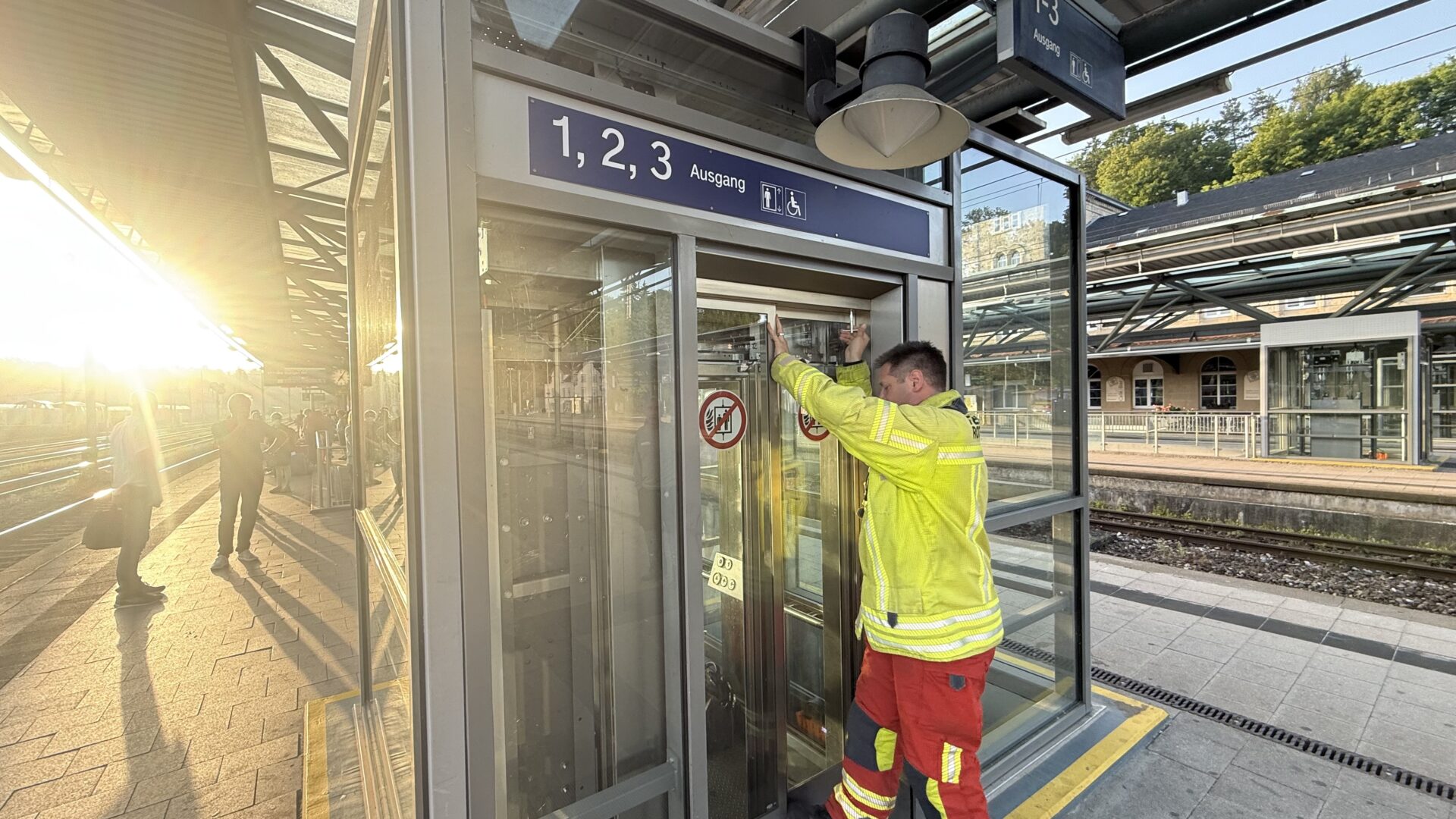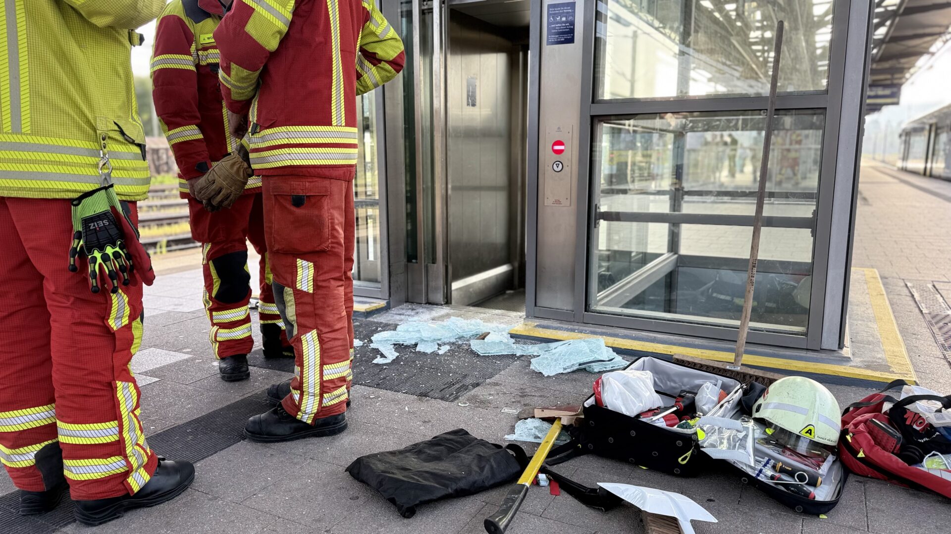 Als zudem feststand, dass die Bahn in absehbarer Zeit keinen Techniker zur Verfügung stellen würde, entschied Einsatzleiter Müller auf rohe Gewalt. „Wir haben sonst keine Möglichkeit, an den Mann ranzukommen“, sagte Müller. Der nächste IC hielt unterdessen an Gleis 5. „Wir schlagen das jetzt ein“, sagte Müller mehr zur Aufzugstür als zur Presse. Blech gab nach. Ein erster Schritt. Und das sogenannte Fensterset, mit dem man Glas aufschneiden kann, aus dem Löschfahrzeug wurde gereicht. Die Lautsprecher am Bahnhof verkündeten: „Gleis 5, bitte steigen Sie ein. Die Türen schließen automatisch. Vorsicht bei der Abfahrt.“ Und weg war auch dieser Zug. Ein Glasschneider war währenddessen am Werk, ein schleifendes Geräusch ertönte.
