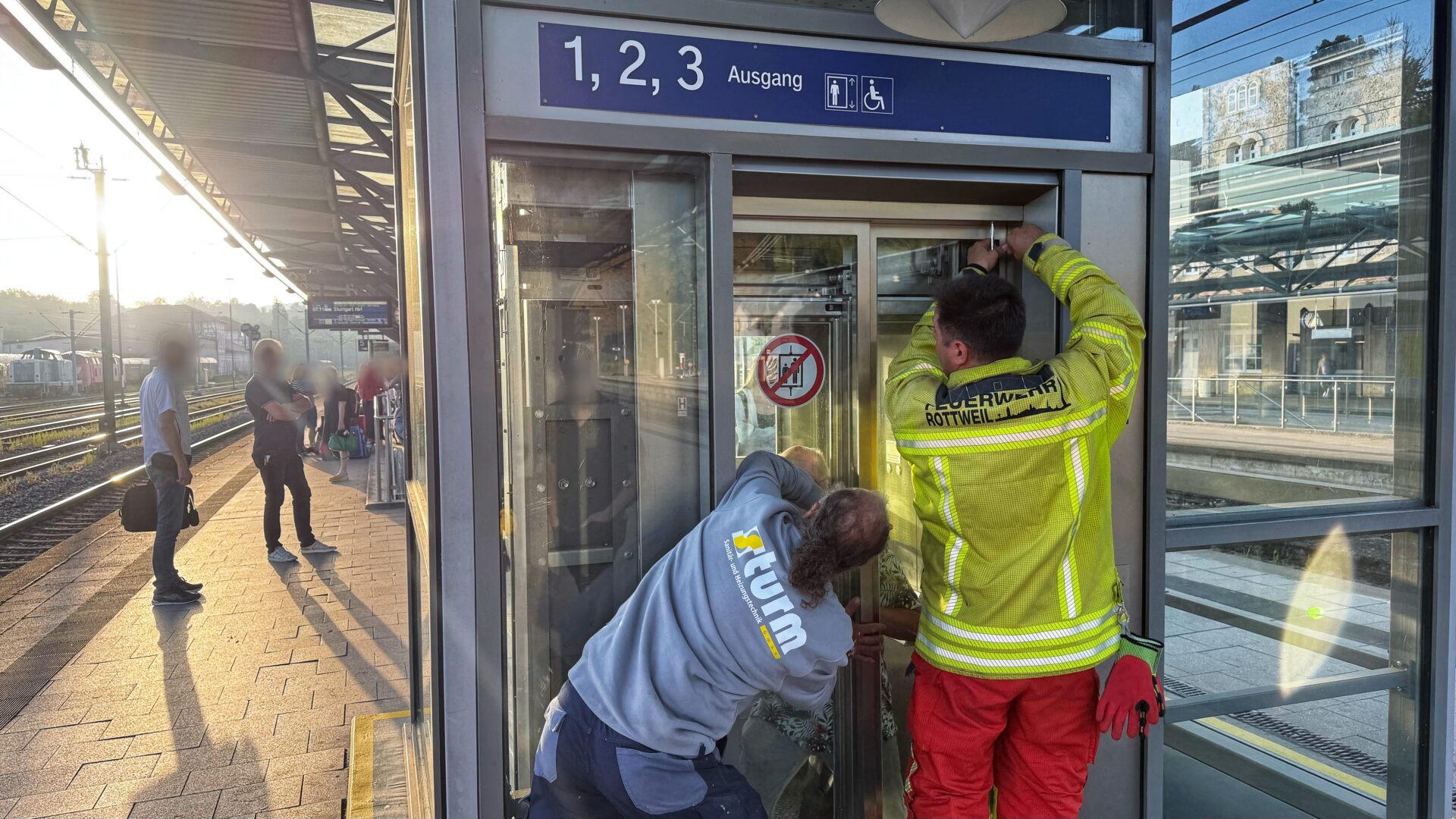Doch am Ende gelang es den Kräften der Feuerwehr, die doppelte Schiebetür, hinter der der Mann immer noch feststeckte, aufzustemmen. Nur allzu widerwillig gab sie nach. Der Mann war frei. Seine beiden möglichen Verbindungen nach Stuttgart hatte er verpasst, aber etwa eine halbe Stunde später, diesmal mit nur einer leichten Verspätung, sollte der nächste Zug in die Landeshauptstadt eintreffen. Der Mann war jedenfalls froh, aus dem Aufzug befreit worden zu sein. Es ging ihm gut, den Rettungsdienst benötigte er nicht.