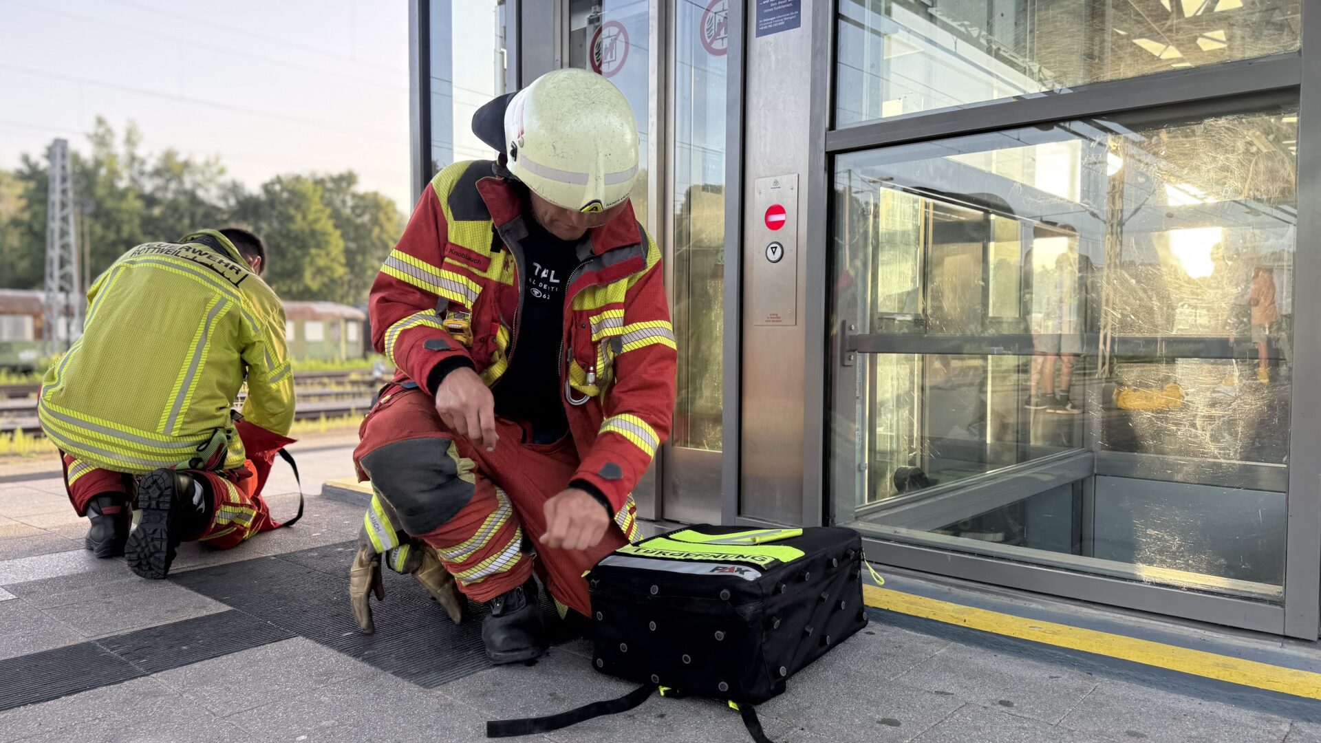 An diesem Mittwoch lief alles anders: Beim Eintreffen Müllers und kurz darauf weiterer Kräfte stand zunächst einmal fest, dass sich tatsächlich ein eingeschlossener Mann im Aufzug zu den Gleisen 4 und 5 befindet. Einige Zentimeter unterhalb der Bahnsteigebene steckte er in der Kabine fest. Die Kräfte der Feuerwehr begannen damit, ihn zu befreien. Das stellte sich als weit komplizierter heraus, als zu erwarten gewesen war.