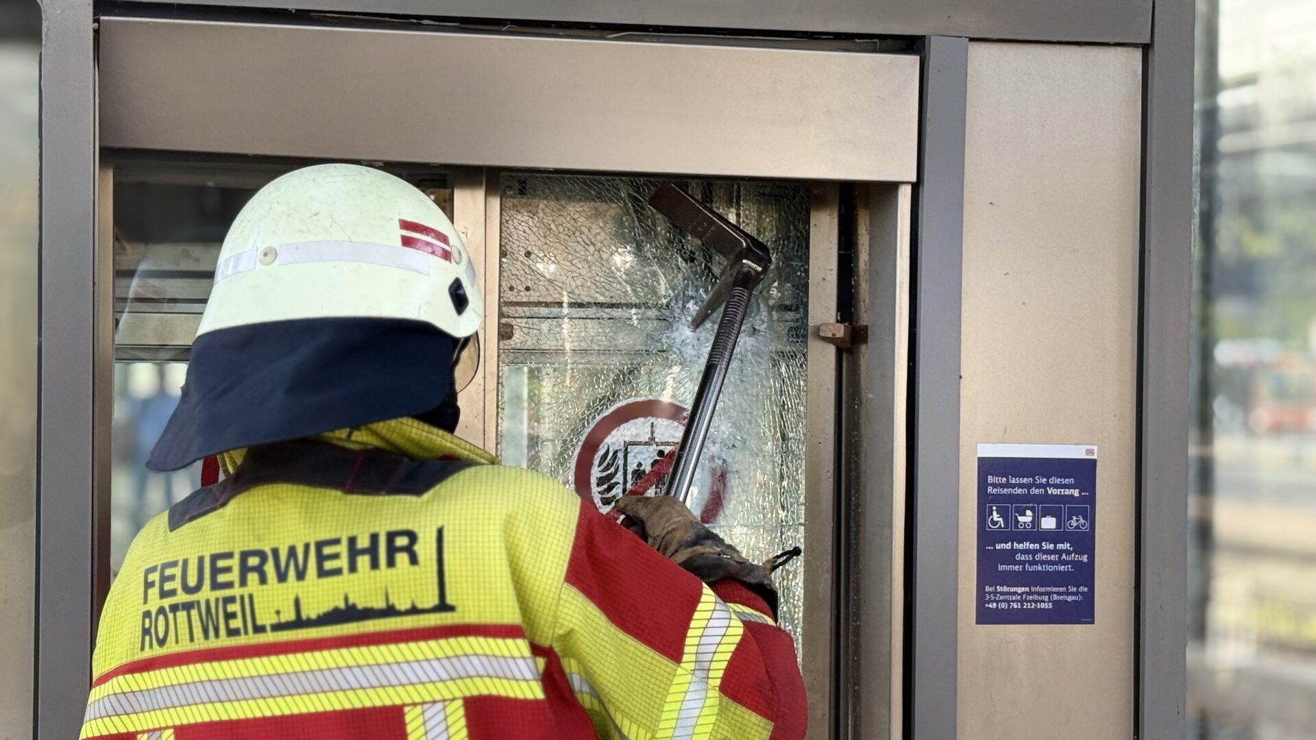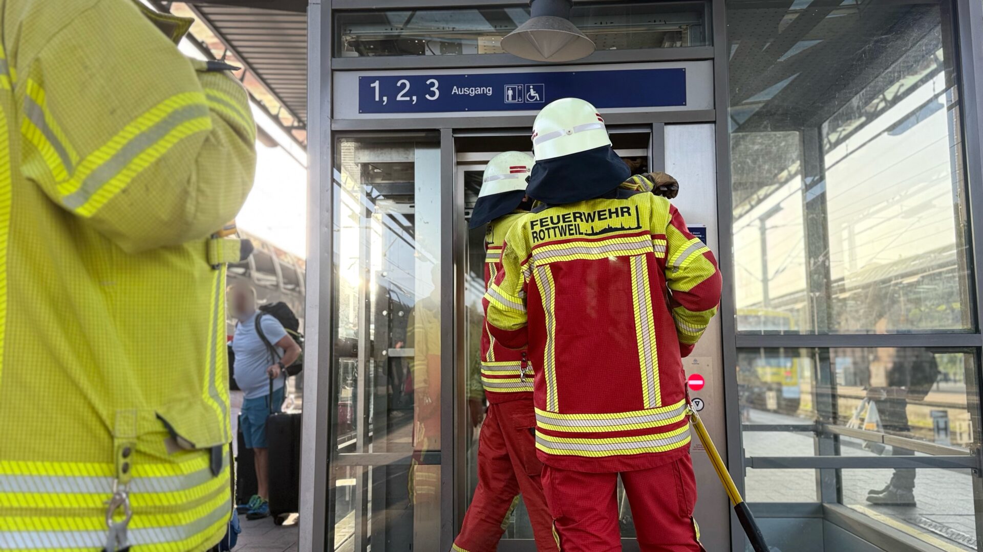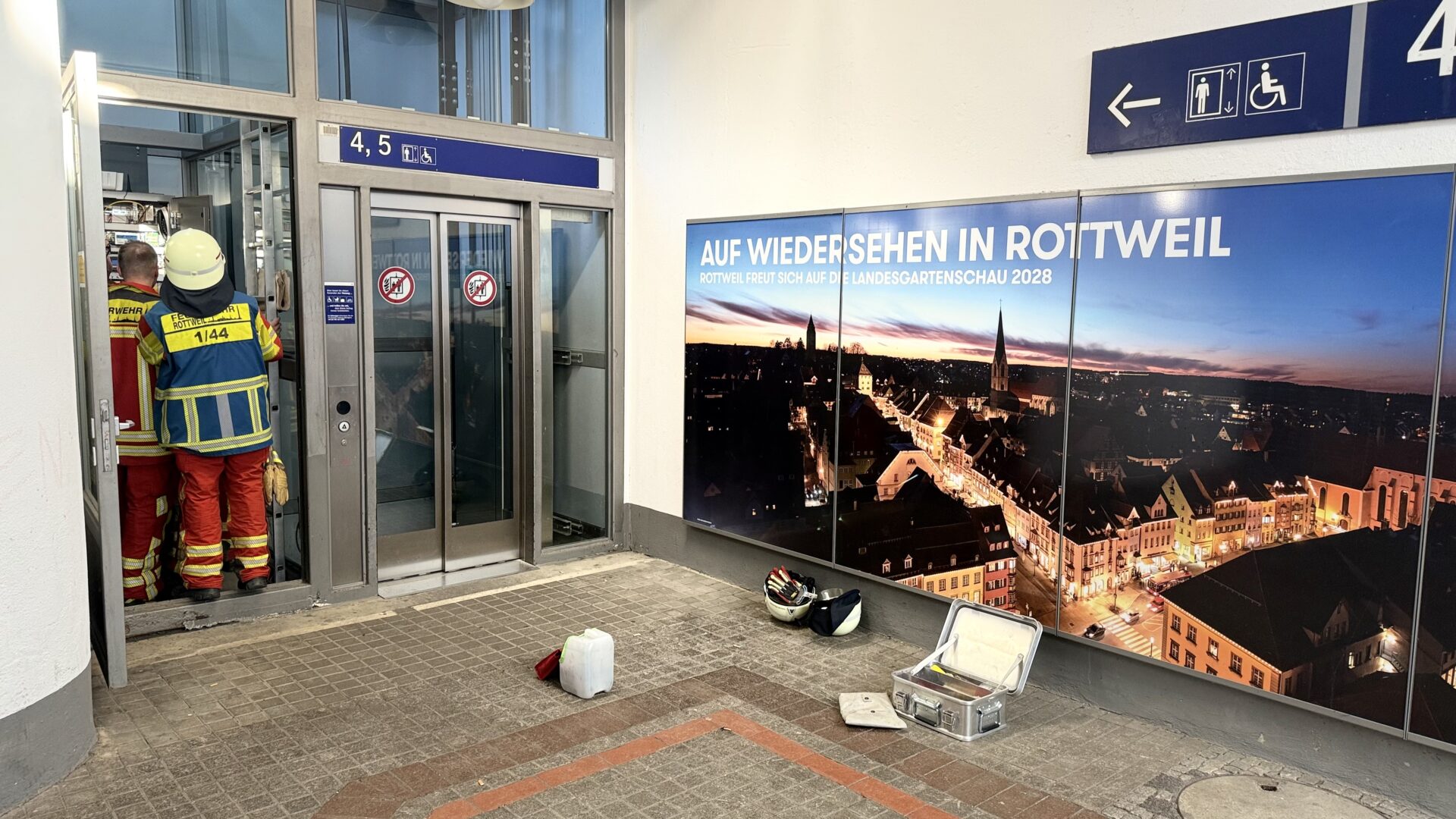 Gar nicht alltäglicher Einsatz für die Rottweiler Feuerwehr: In einem Aufzug am Rottweiler Bahnhof steckte eine gute Dreiviertelstunde lang ein Mann fest – und die Technik, als hätte sie einen eigenen Willen, weigerte sich beharrlich, ihn freizugeben. Schließlich wandte die Feuerwehr Gewalt an. Und siegte.