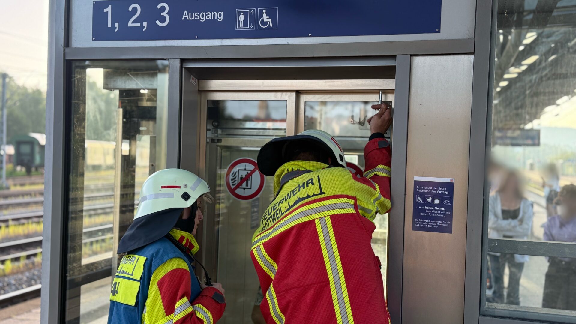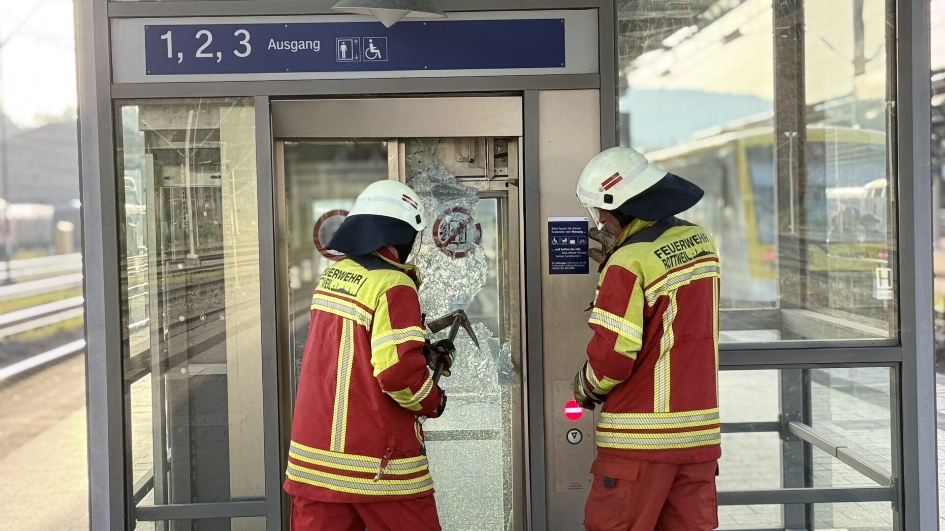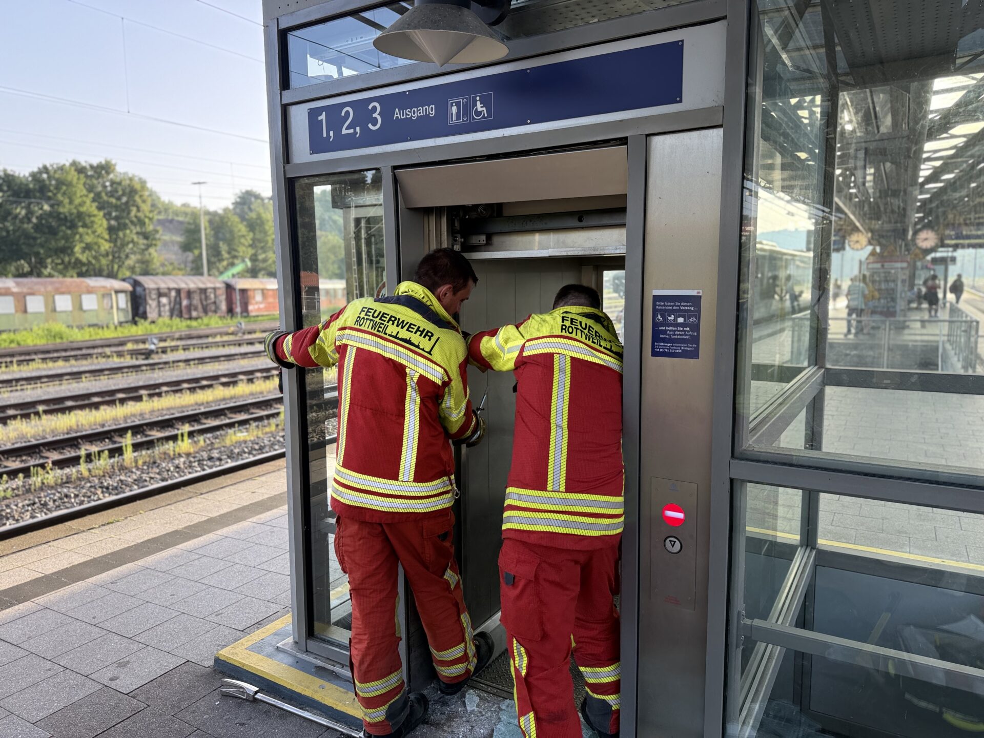 Gar nicht alltäglicher Einsatz für die Rottweiler Feuerwehr: In einem Aufzug am Rottweiler Bahnhof steckte eine gute Dreiviertelstunde lang ein Mann fest – und die Technik, als hätte sie einen eigenen Willen, weigerte sich beharrlich, ihn freizugeben. Schließlich wandte die Feuerwehr Gewalt an. Und siegte.