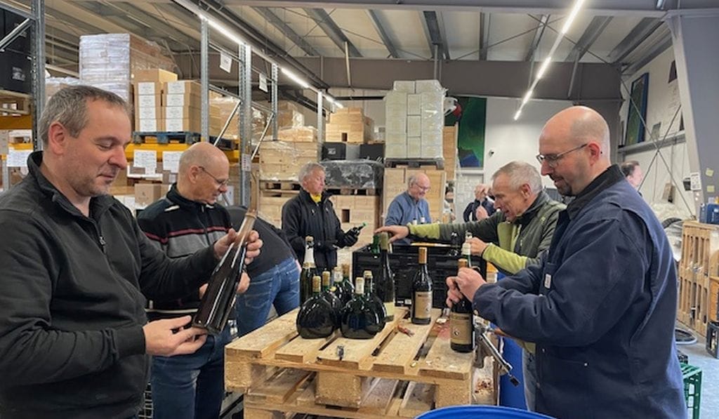 Rottweil – Dass aus Wein, der zu viele Jahre im Keller lagerte und nicht mehr als trinkbar eingestuft wird, guter Weinbrand entstehen kann, ist nicht jedem bekannt. In mehreren Wochen des Sammelns sind mittlerweile rund 2000 Flaschen zusammengekommen, die zunächst in Gitterboxen der Spedition Hugger lagerten und schließlich in den letzten Tagen von einer Gruppe von Rotariern entkorkt wurden.