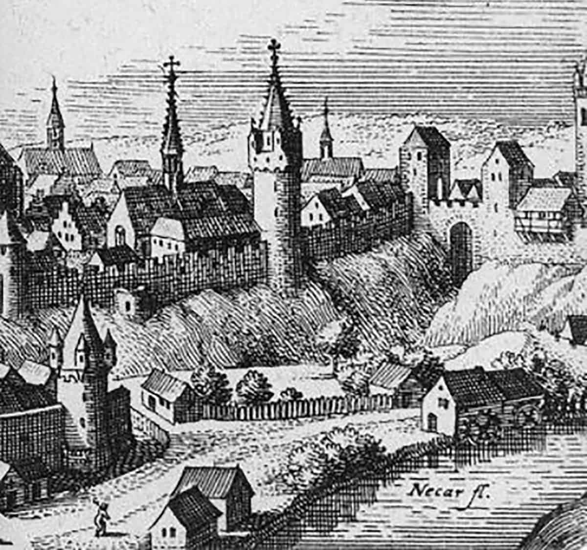 Auf dem berühmten Stich mit der Rottweiler Stadtansicht von Matthäus Merian aus dem Jahr 1643 (Bild oben) ist das Gotteshaus gut zu erkennen: An der Südostecke der Stadt über dem Neckartal ragt es mit einem zierlichen Türmchen heraus. Nach der Aufhebung der Kommende 1809 wurde die Kirche 1826 abgebrochen.
