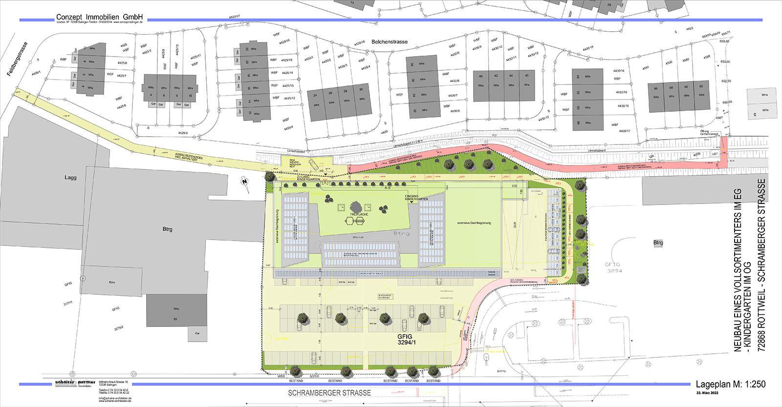 der kurzen Wege. Gleichzeitig soll durch eine Stapelung der Nutzungen auf einer Brachfläche ein´Beitrag zur Reduzierung des Flächenverbrauchs geleistet werden.Im Zuge der Planung soll eine fußläufige Anbindung des Marktes und des Kindergartens an die Belchenstraße im Süden und die Feldbergstraße im Osten über eine rückwärtige Erschließung mit Fußweg bauplanungsrechtlich gesichert werden. Hierdurch soll die Zugänglichkeit des Wohngebiets Charlottenhöhe und der Wohnbebauung östlich der Feldbergstraße für den nichtmotorisierten Individualverkehr erhöht und so örtlich die Nahversorgung und das