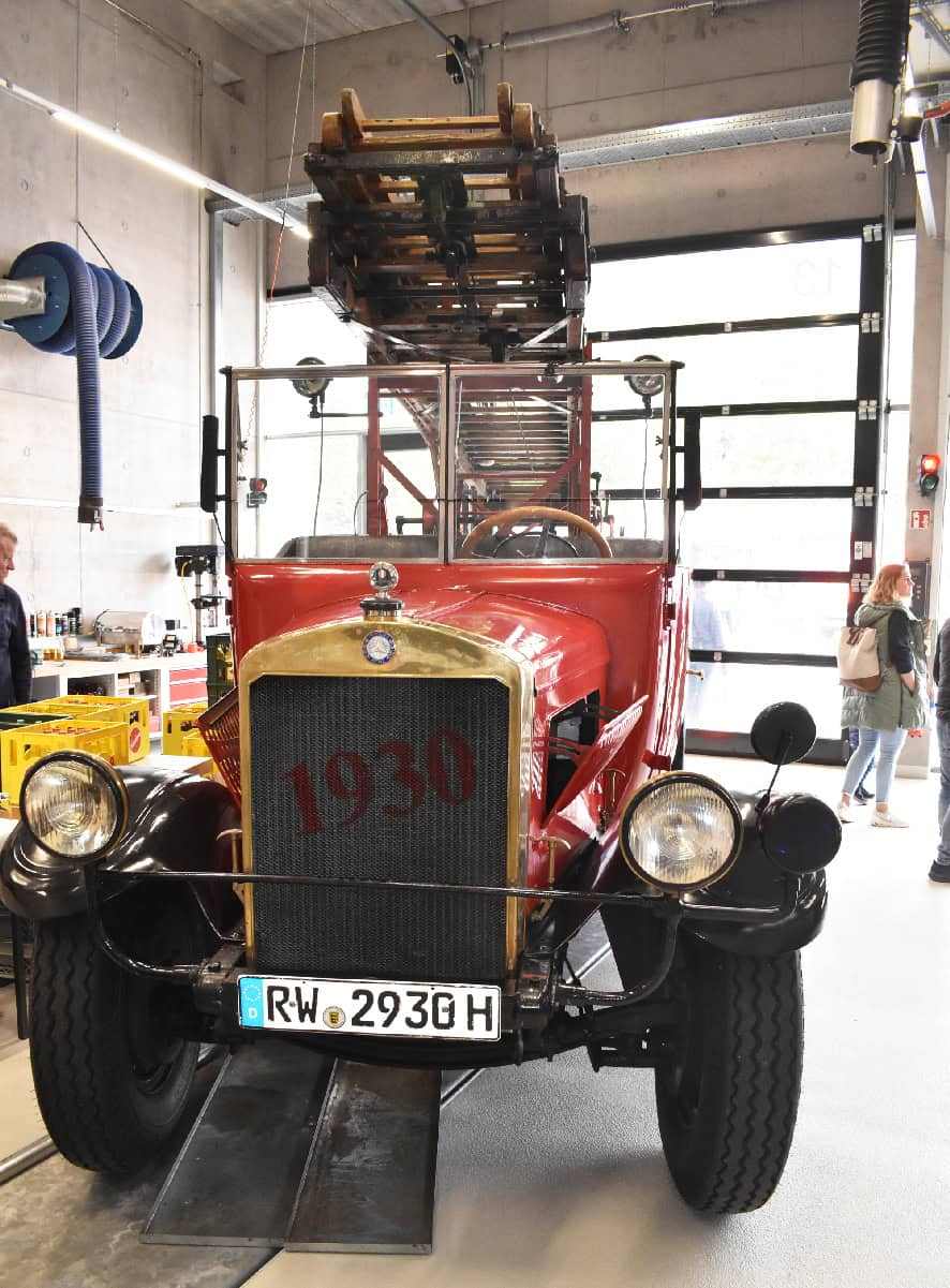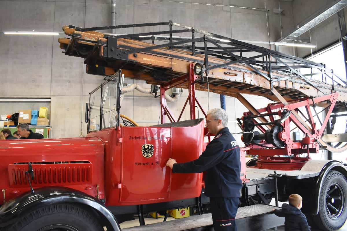 Pressesprecher Rüdiger Mack zeigt den Oldtimer, eine Drehleiter aus dem Jahr 1930.