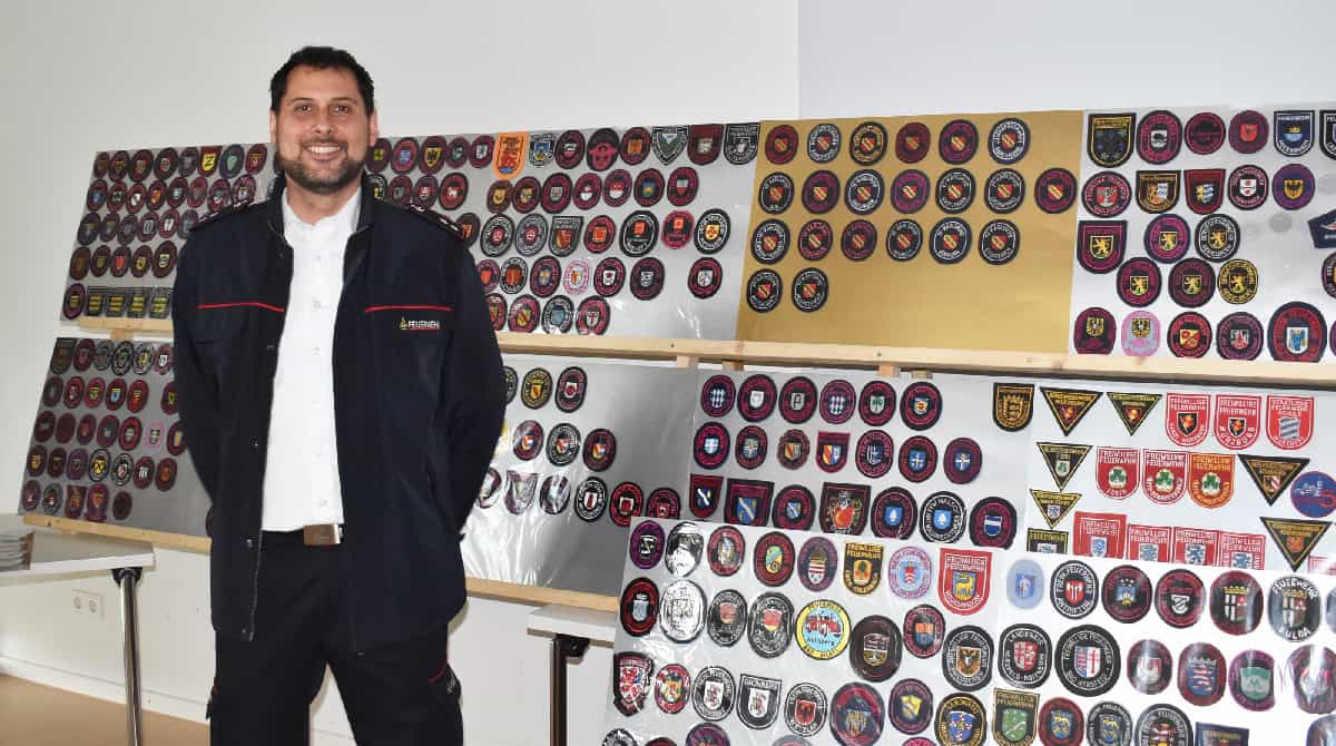 Bernd Müller zeigt einen Teil seiner Ärmelabzeichen-Sammlung – 2345 Exemplare beispielsweise von allen Berufsfeuerwehren landesweit, aber auch von vielen Betriebs- und Freiwilligen Feuerwehren im Land und international.