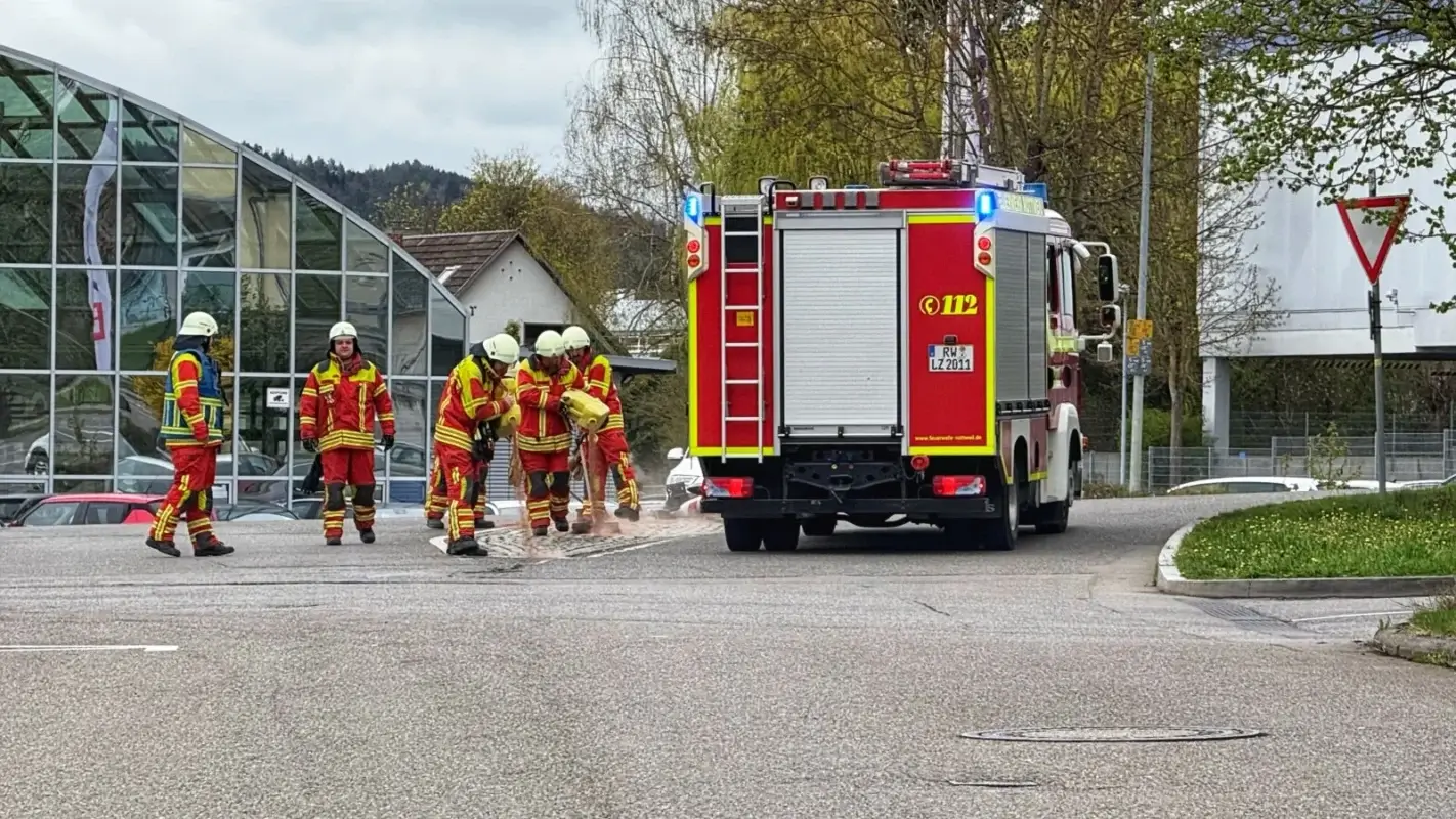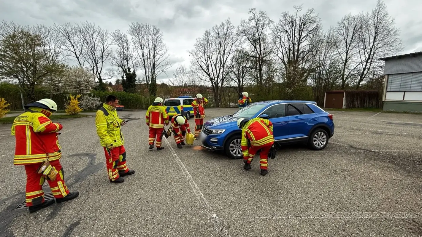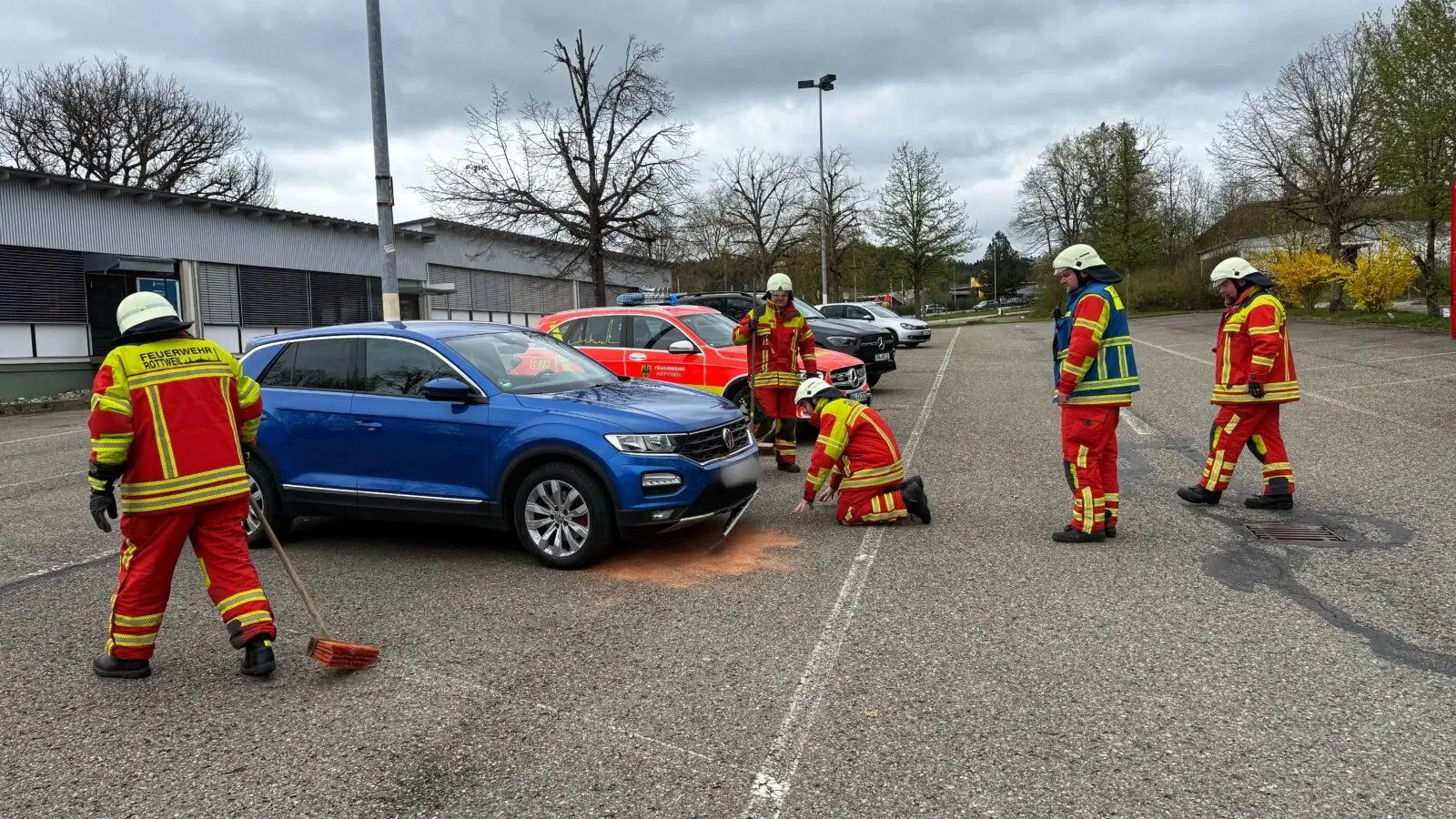 Was sie fanden: einen auf einem Parkplatz nahe der Tuttlinger Straße liegengebliebenen Volkswagen T-Roc und einen wohl nicht mehr fahrtüchtigen Lenker dieses Autos. Am VW war die Ölwanne aufgerissen, weshalb die Beamten die Feuerwehr hinzu riefen. Ein Löschfahrzeug mit einem gut gelaunten Team aus der Altstadt und Stadtbrandmeister Frank Müller fuhren die Einsatzstelle an. Rasch banden sie das Öl ab.