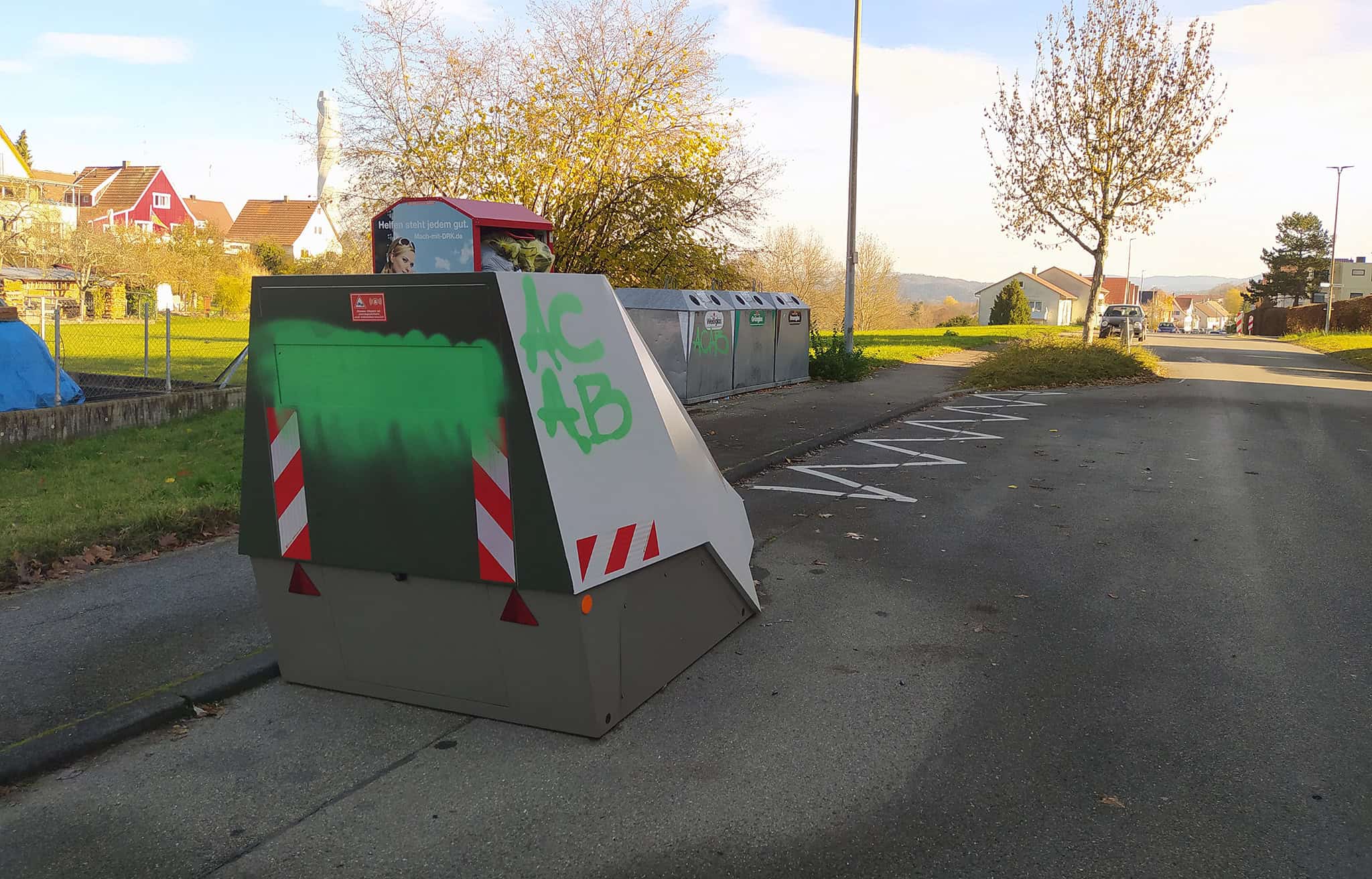 Zudem hat ein Unbekannter die Buchstaben „ACAB“ aufgesprüht – „all cops ar bastards“, eine Beleidigung gegen die Polizei. Die, das wusste der Täter vielleicht nicht, ist aber gar nicht für die Blitzer in der Stadt zuständig. Aber „Alle Ordnungsamtsmitarbeiter sind Schweine“ – das macht sich nicht so gut und dafür gibt es auch keine in der linksautonomen Szene gängige Abkürzung.