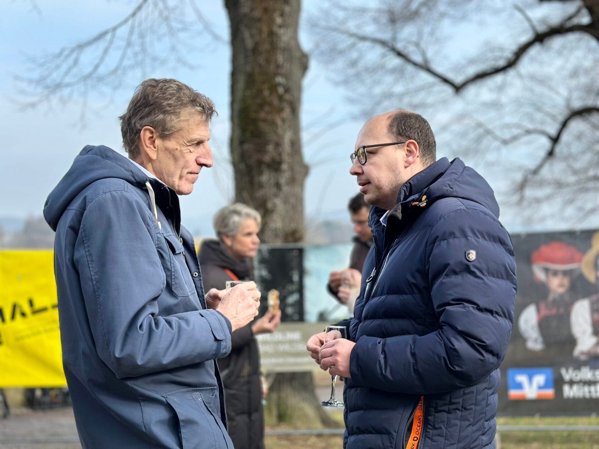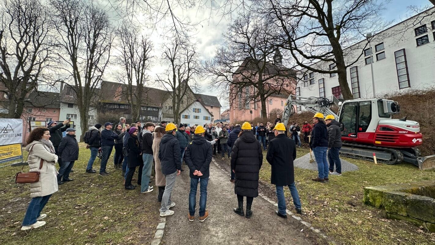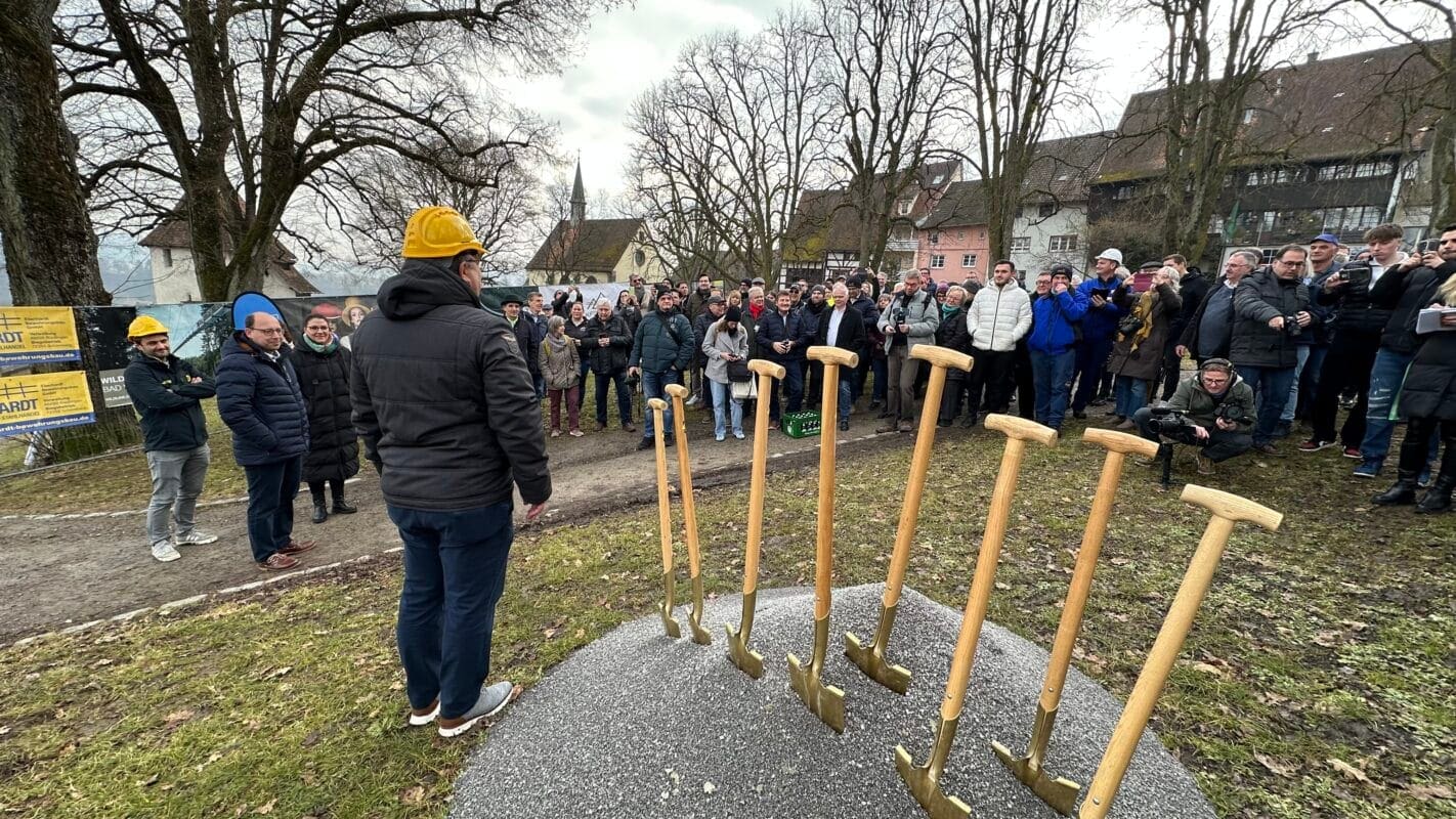 Jetzt geht es tatsächlich los, Schlag auf Schlag, jetzt wird geliefert: eine Fußgänger-Hängebrücke, die zwei Top-Sehenswürdigkeiten – den TK Elevator Testturm für Aufzugsinnovationen und die historische Innenstadt von Rottweil – als eine weitere Attraktion verbinden soll, wie Oberbürgermeister Dr. Christian Ruf jüngst sagte. Eine Brücke, die 100.000 Besucher anlocken soll. Und die, geht es nach dem Ideengeber, nun eine Initialzündung sein soll. Am Montag fand der Spatenstich statt mit Sekt und Hefezopf.