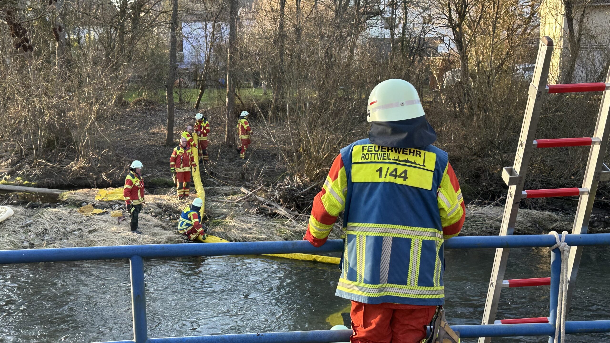 Am Morgen war aus einem Silo eines Kunststoff verarbeitenden Betriebs in Rottweil-Bühlingen eine zähe, transparente Flüssigkeit ausgelaufen. Die etwa 300 bis 500 Liter bedeckten eine Fläche von rund 150 Quadratmetern auf dem Hof. Und tun dies mit Stand vom Montagabend noch, sind allerdings von Einsatzkräften der Feuerwehr mittlerweile gebunden. Am Dienstag soll das Gebinde entsorgt werden, hieß es. Am Vormittag schien mit dem Abschluss der Einsatzarbeiten der Feuerwehr auch alles rund um diesen Chemieunfall erledigt – bis Vertreter der Unteren Wasserschutzbehörde des Landratsamts doch, entgegen erster Annahmen, auf eine Verschmutzung des Neckars stießen, der unmittelbar an dem Kunststoffbetrieb vorbeifließt. In der Altstadt, ein paar Kilometer weiter, zeigten ihre Messstreifen eine ölhaltige Substanz. Die Feuerwehr wurde erneut alarmiert.
