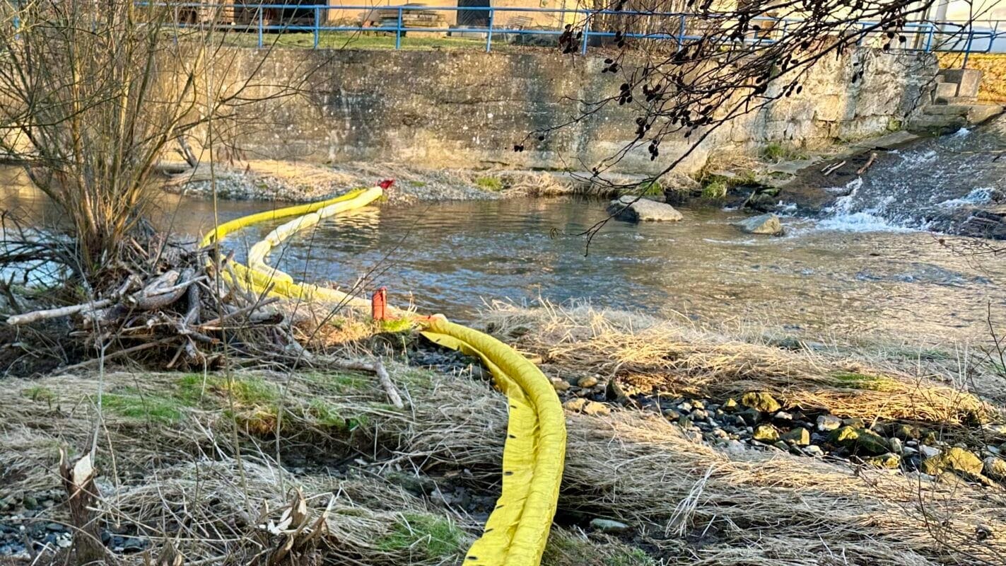 Messungen der Rottweiler Wehr bestätigten eine mineralölhaltige Flüssigkeit auf der Neckaroberfläche. Auf Höhe der Brücke errichteten die Einsatzkräfte einerseits im Neckar selbst, zudem im Triebwerkskanal entlang der Tuttlinger Straße. Wie Einsatzleiter Frank Müller informierte, besteht die Sperre aus zwei Komponenten, die auf den Fließgewässern aufliegen: dicken, saugfähigen Schläuchen, einst produziert in der Rhodia in Rottweil, die die Flüssigkeit aufnehmen sollen. Und dahinter eine 25 Meter lange Ölsperre in Form ebenfalls eines Schlauchs, der auftretende dickere Flüssigkeiten wie Öl aufzustauen imstande ist. Dieser Schlauch ist mit Pressluft gefüllt – und muss nun alle zwei bis drei Stunden nachgefüllt werden, auch über Nacht, auch von Kräften der Rottweiler Feuerwehr, weil er allmählich an Druck verliert.