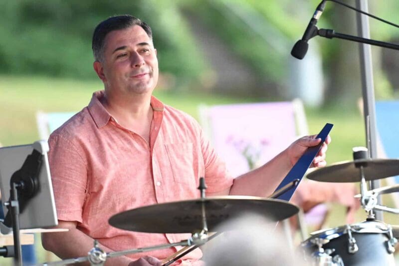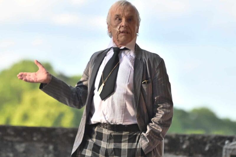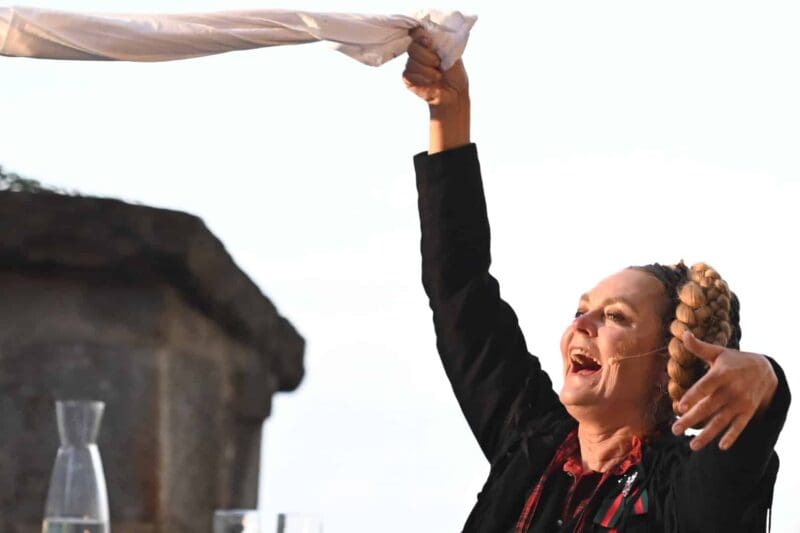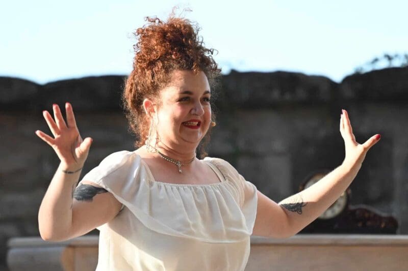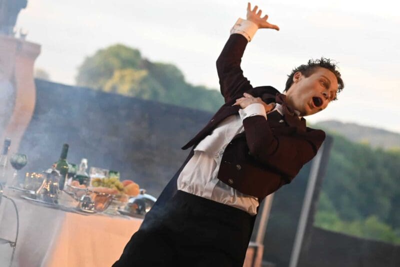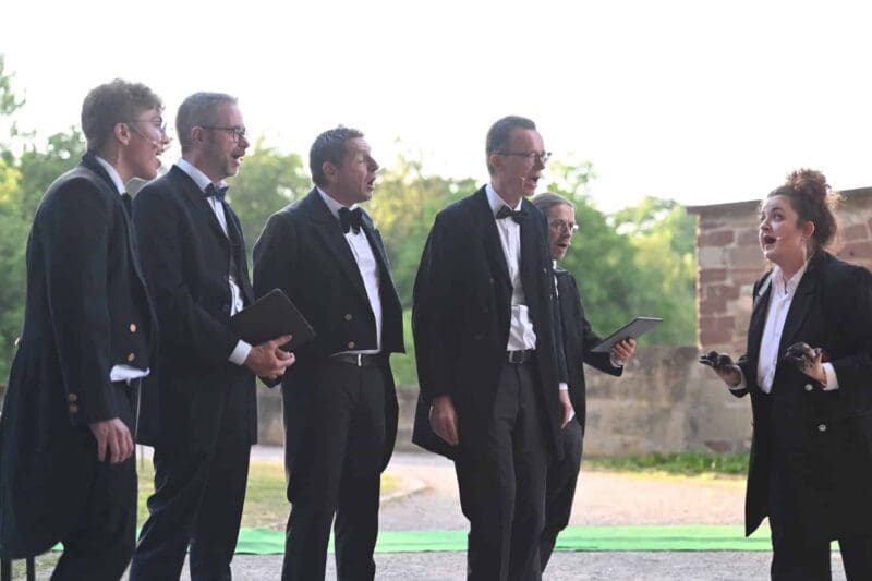 Vollends zu einem runden, inspirierenden Sommerabend wird die Inszenierung durch die musikalischen Impulse: Dorin Grama und Nicholas Charkviani verleihen den Szenen dezent mehr Atmosphäre. Und eine schöne, gutgelaunt-verschmitze Kommentarebene steuert ein munterer Chor bei, der von Robert Kopf komponierte Couplets einbringt – scherzhaft-satirische Strophenlieder voller Anspielungen, bei denen man unter anderem den in Rottweil nicht unbekannten Seufzer „O jerum“ heraushört.