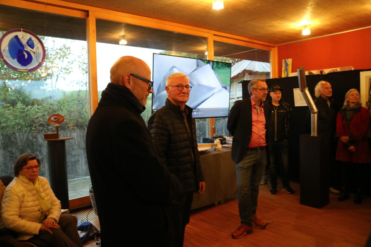Dann ging es ein Stück weiter runter, an den Kuhweiden vorbei, zu Tobias Kammerers Skulpturengarten und in sein Atelier. Hier wartete auf die Besucher nicht nur eine beeindruckende Sammlung von Werken Erich Hausers, sondern auch Gerhard Link, der über 30 Jahre in Hausers Werkstatt dessen Edelstahlskulpturen herstellte. Und der viele Anekdoten auf Lager hatte: Von wilden Parties, als Silvester bis zum Neujahrsabend durchgefeiert wurde und Hauser selbst irgendwann einfach umfiel. Als ein Künstlerfreund von ihm das Geschirr vom Kran an der Decke auf den Hallenboden warf, und von einem gerade 21-jährigen Link, der nach drei Tagen schon alleine arbeiten musste, weil Erich Hauser nach Sao Paolo musste.