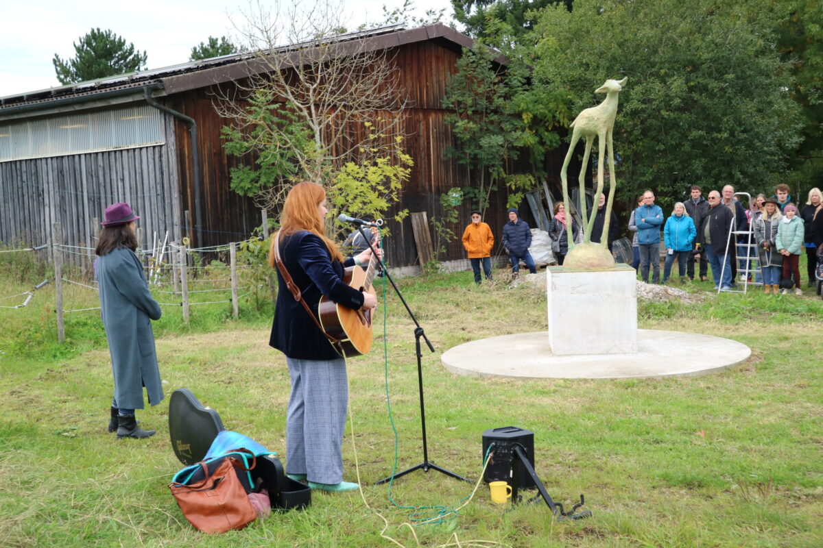 Musikalisch weihte die irische Sängerin Lynda Cullen die Skulptur ein – auch ein „Wandervogel“, wie Matthias Graf-Hetzler Künstlerin und Musikerin nannte – aus der Fremde in Rottweil heimisch geworden. Nach vorne gehen und in die Zukunft schauen wie das Schaf, das weit übers Land blickt und zur Einweihung von Schäferin Bianca Pfitzenmeier vom Eckhof eine echte Schaf-Glocke um den Hals gehängt bekam.