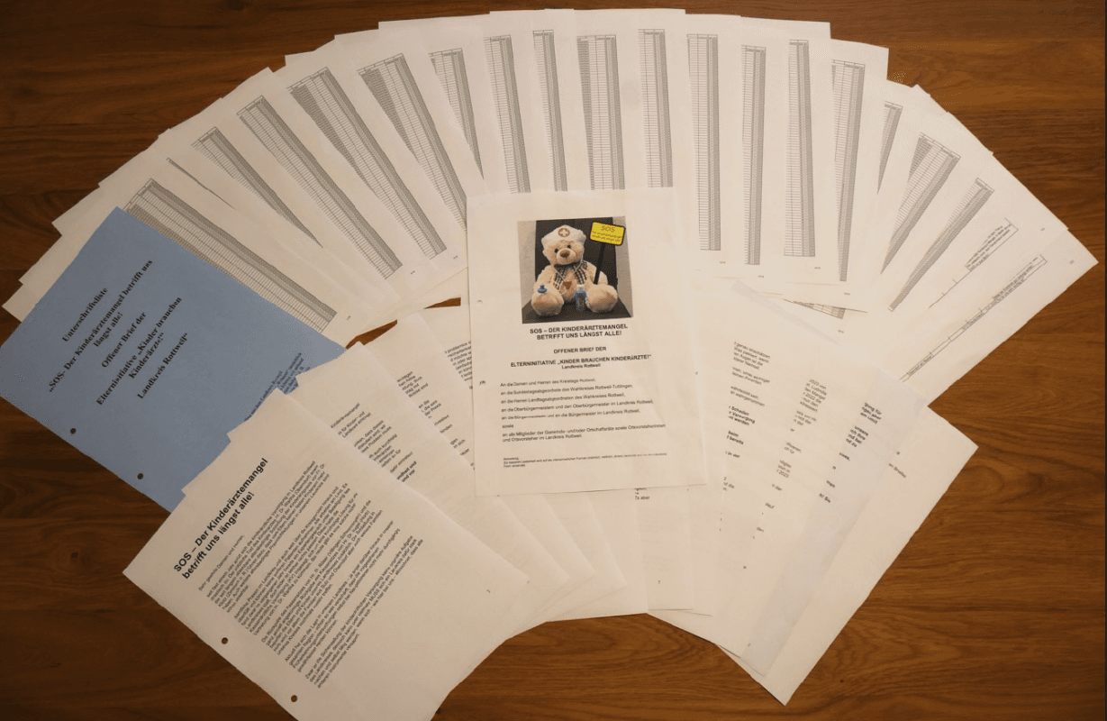 Parallel zur Unterschriftenaktion hat die Bürgerinitiative in den drei Landkreisen Rottweil, Freudenstadt und Zollernalbkreis Gespräche etwa mit Bürgermeistern und Landtags- sowie Bundestagsabgeordneten sowie Landräten und Kreisräten gesucht – und auch der Kassenärztlichen Vereinigung. „Das Thema beschäftigt nicht mehr nur betroffene Eltern, sondern wird nun auch öffentlich diskutiert“, heißt es in einer Mitteilung der Initiative. An den Rottweiler Landrat Dr. Wolf-Rüdiger Michel und den Leiter des Rottweiler Gesundheitsamts, Dr. Heinz-Joachim Adam, sind die Unterschriften der bereits abgeschlossenen Sammelaktion so übergeben worden. „Dies ist ein großer und wichtiger erster Schritt“, so die Initiative. „Vielfach war zuvor für nicht unmittelbar Betroffene gar nicht klar, wie sehr sich die kinderärztliche Versorgung hier in unserer Region teilweise schon zugespitzt hat“, heißt es weiter. Den Mandatsträgerinnen und -trägern sei dies zwar häufig bekannt gewesen, „doch was dies für betroffene Eltern konkret bedeutet, wussten auch sie häufig nicht“.