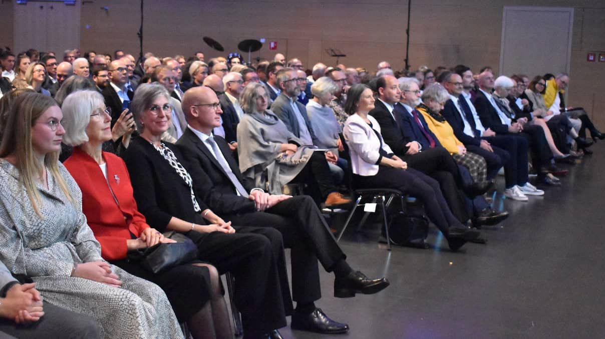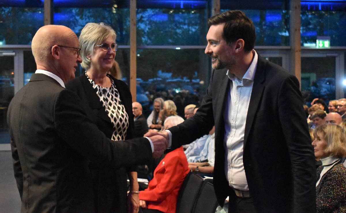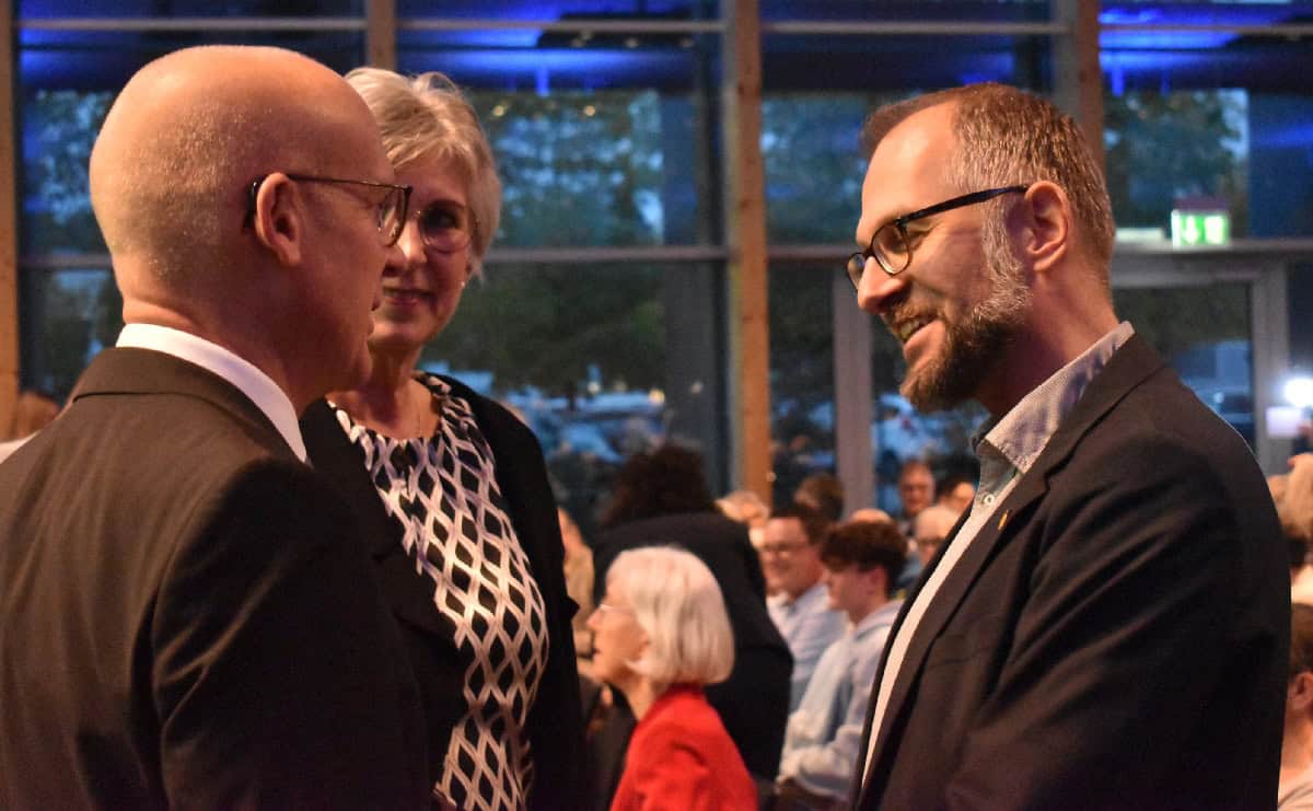 In der gut gefüllten Stadthalle in der ersten Reihe: Ralf Broß mit Frau Friederike, daneben Broß' Vorgängerin Gudrun Heute-Blum. Fotos: wede
