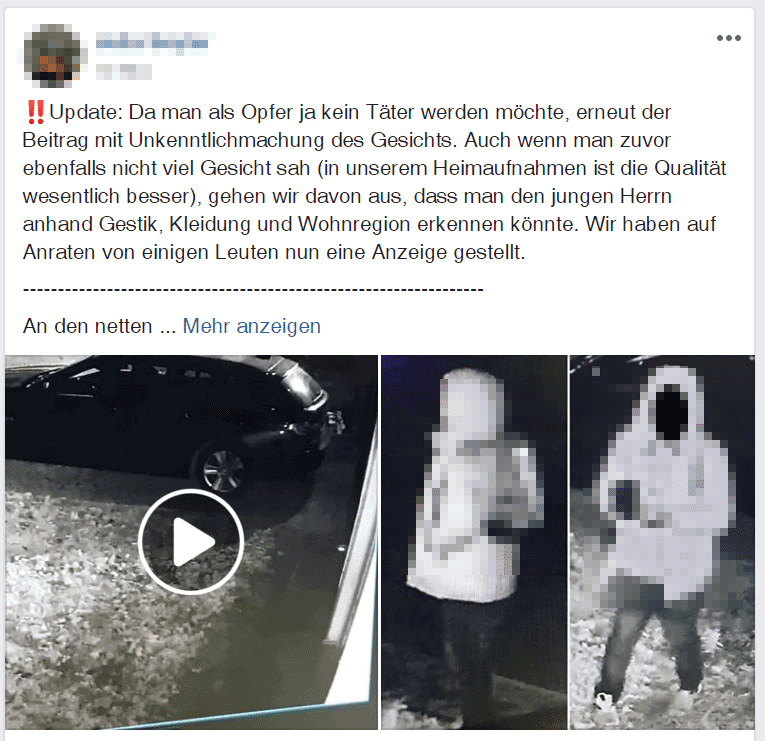 Das haben auch die Diebstahlopfer gemerkt. Und reagiert. „Wir haben auf Anraten von einigen Leuten nun eine Anzeige gestellt“, heißt es. Man wolle vom Opfer ja nicht selbst zum Täter werden. Der mutmaßliche Dieb ist auf den nun gezeigten Bildern unkenntlich gemacht. Ob die ursprünglichen Bilder geteilt worden sind, auf denen er besser zu sehen ist, ist unklar. Aber beim Fahndungsaufruf bleibt’s. So gehen die Veröffentlicher „davon aus, dass man den jungen Herrn anhand Gestik, Kleidung und Wohnregion erkennen könnte.“