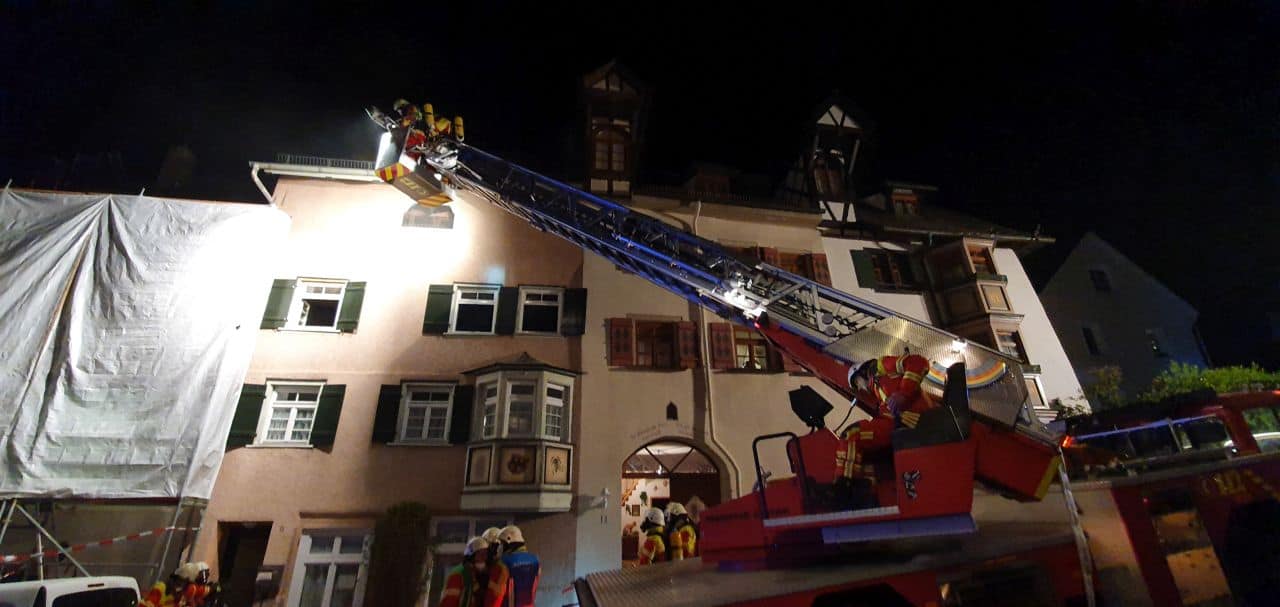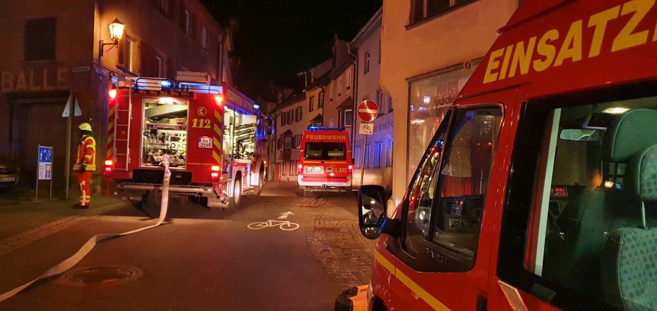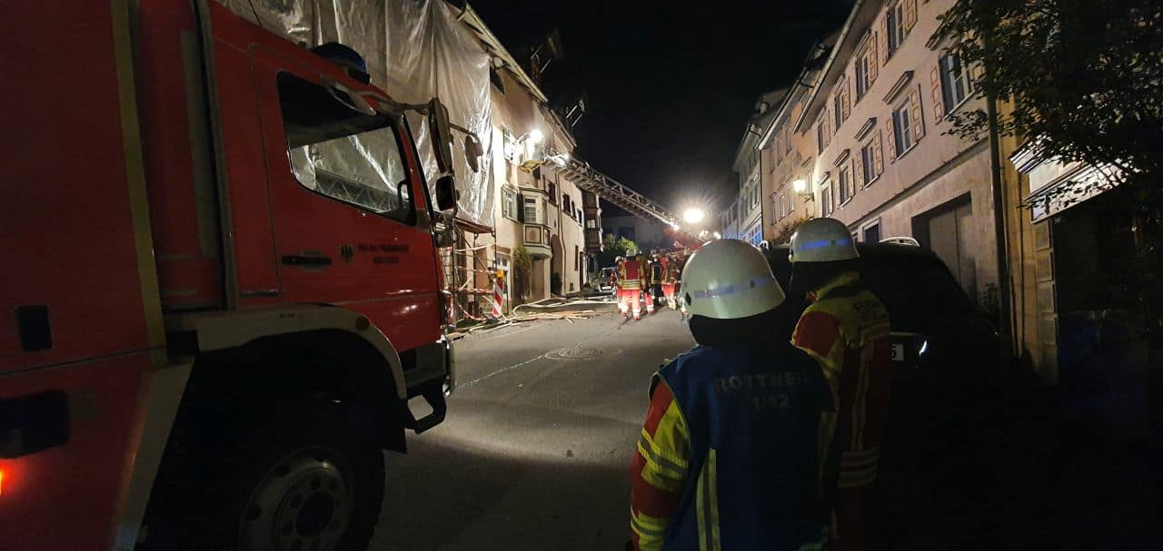 In einem Gebäude in der Rottweiler Innenstadt ist in der Nacht zu Sonntag ein Brand ausgebrochen. Die Feuerwehr Rottweil war im Vollalarm. Das DRK rückte mit einer großen Zahl ehrenamtlicher Helfer an.