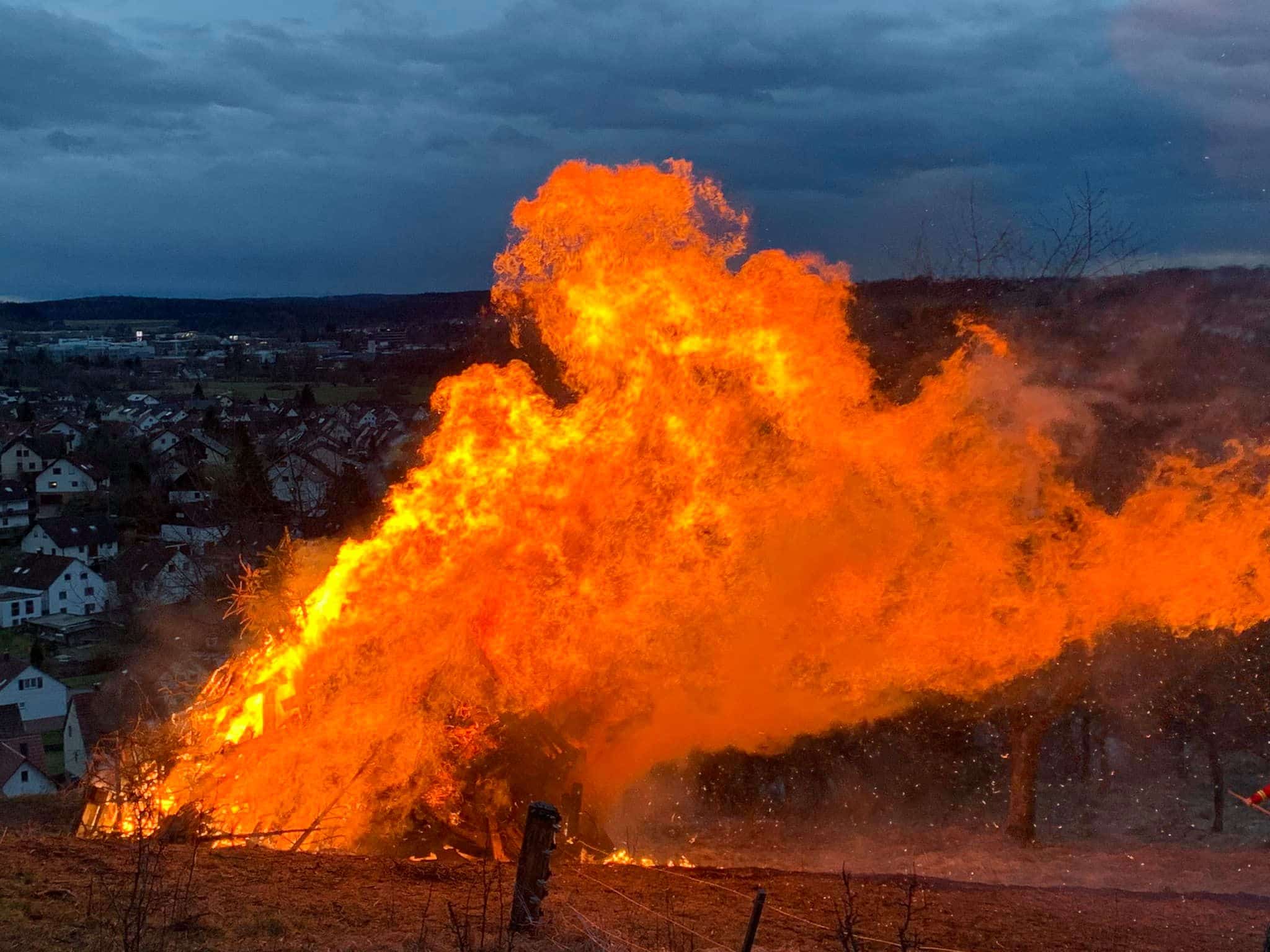 Ein Video auf Facebook zeigt die Ausmaße, die das Funkenfeuer am Sonntagabend angenommen hatte. Aufkommender Wind hatte den Hang oberhalb des Feuerplatzes rasch in Brand gesetzt. Einsatzkräfte der Abteilung Göllsdorf der Rottweiler Feuerwehr, ohnehin als Brandwachen vor Ort, mussten mal geschwind zeigen, was sie drauf haben, und löschten den zusätzlichen Brand mit Feuerpatschen. Und teils mit ihren Stiefeln.