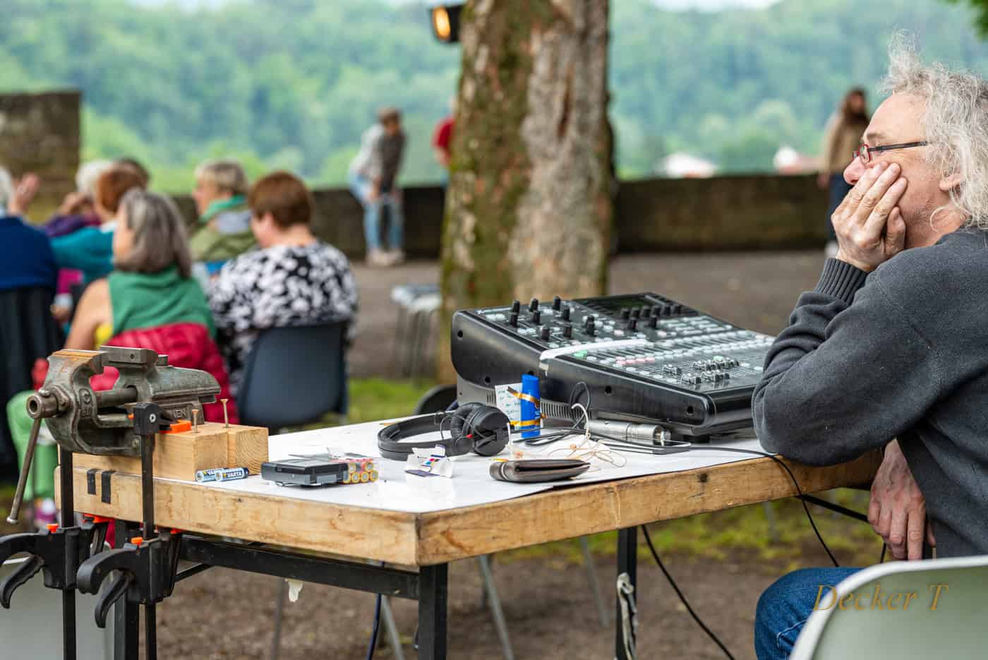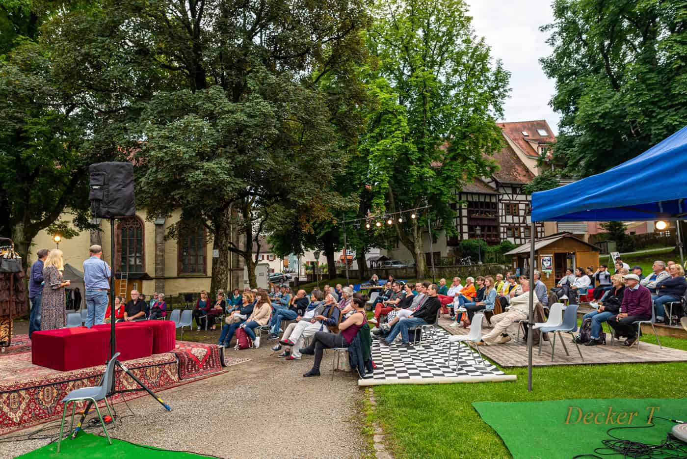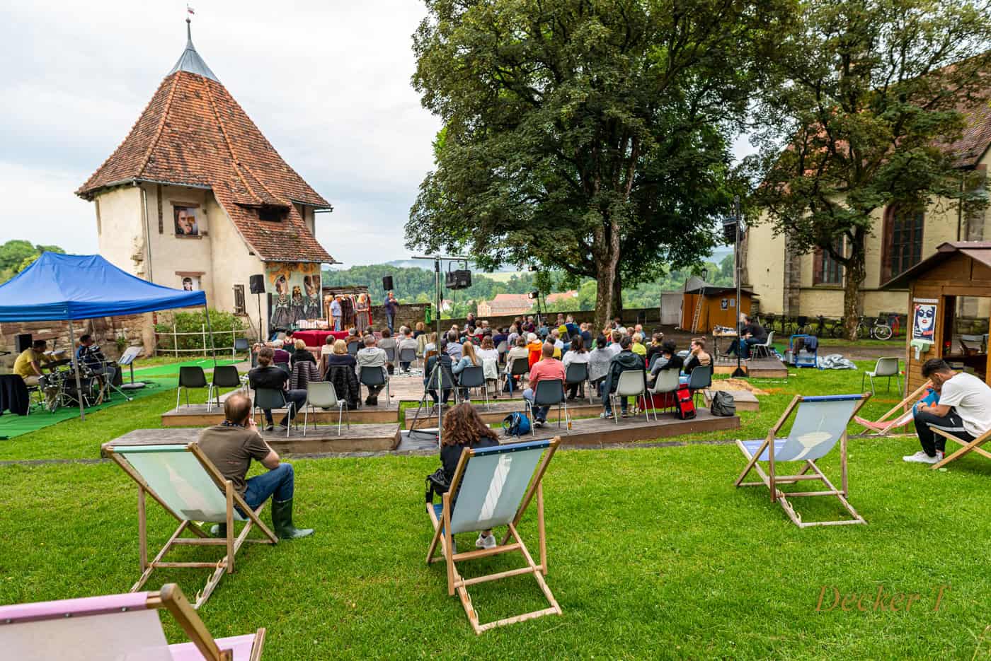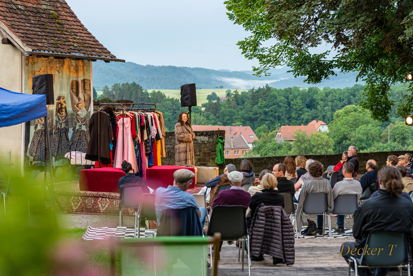 Es war ein Experiment: Die Theaterbesucher sitzen nicht wie sonst bei den beliebten Freilicht-Aufführungen dicht an dicht auf der knarzenden Tribüne, sondern weiträumig im Bockshof verteilt. Sie sollen auf Abstand und Einhaltung der Hygieneregeln achten.